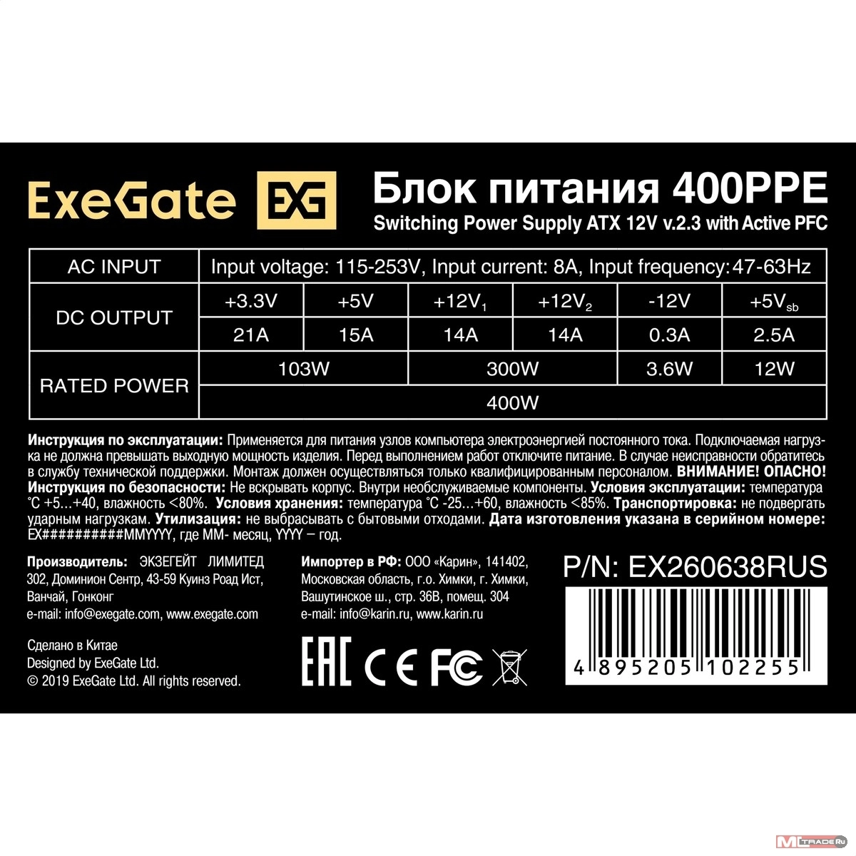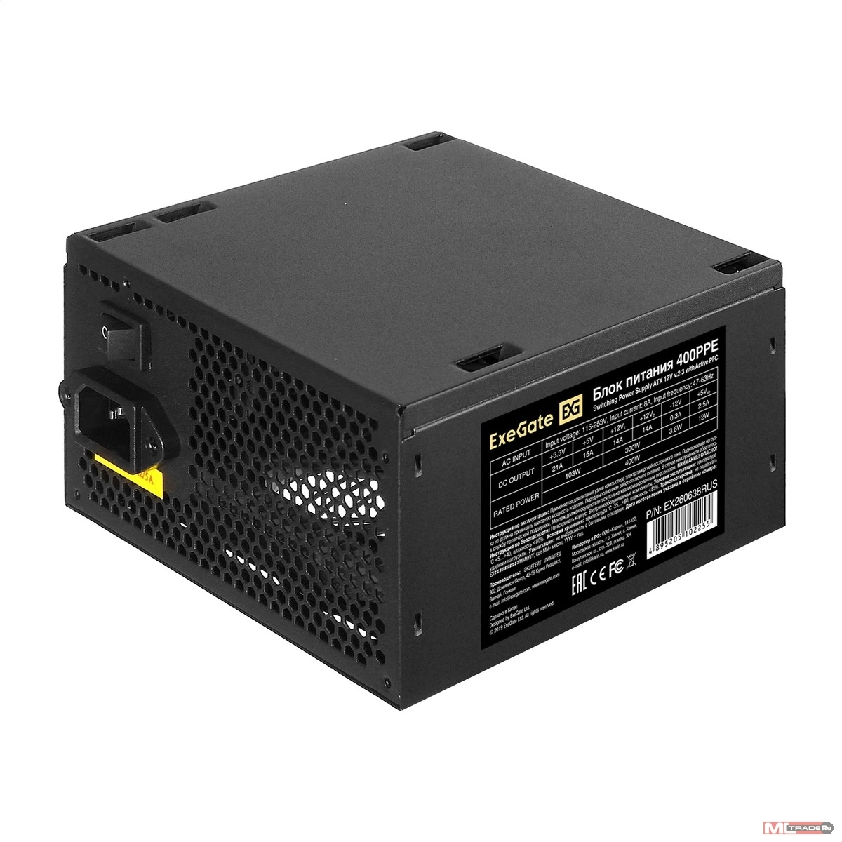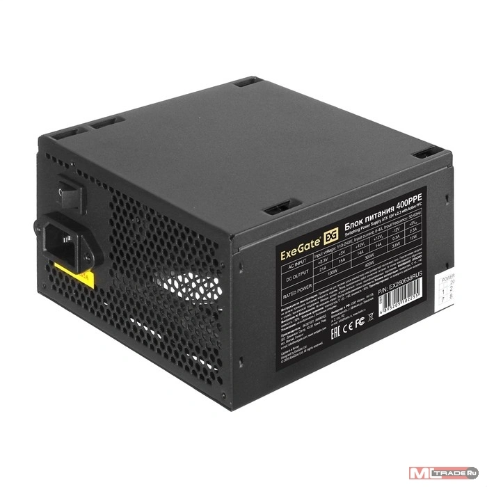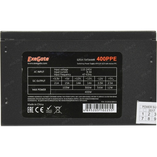 Блок питания Exegate EX260638RUS Блок питания 400W Exegate 400PPE, ATX, black, APFC, 12cm, 24p+4p, PCI-E, 3*IDE, 5*SATA, FDD