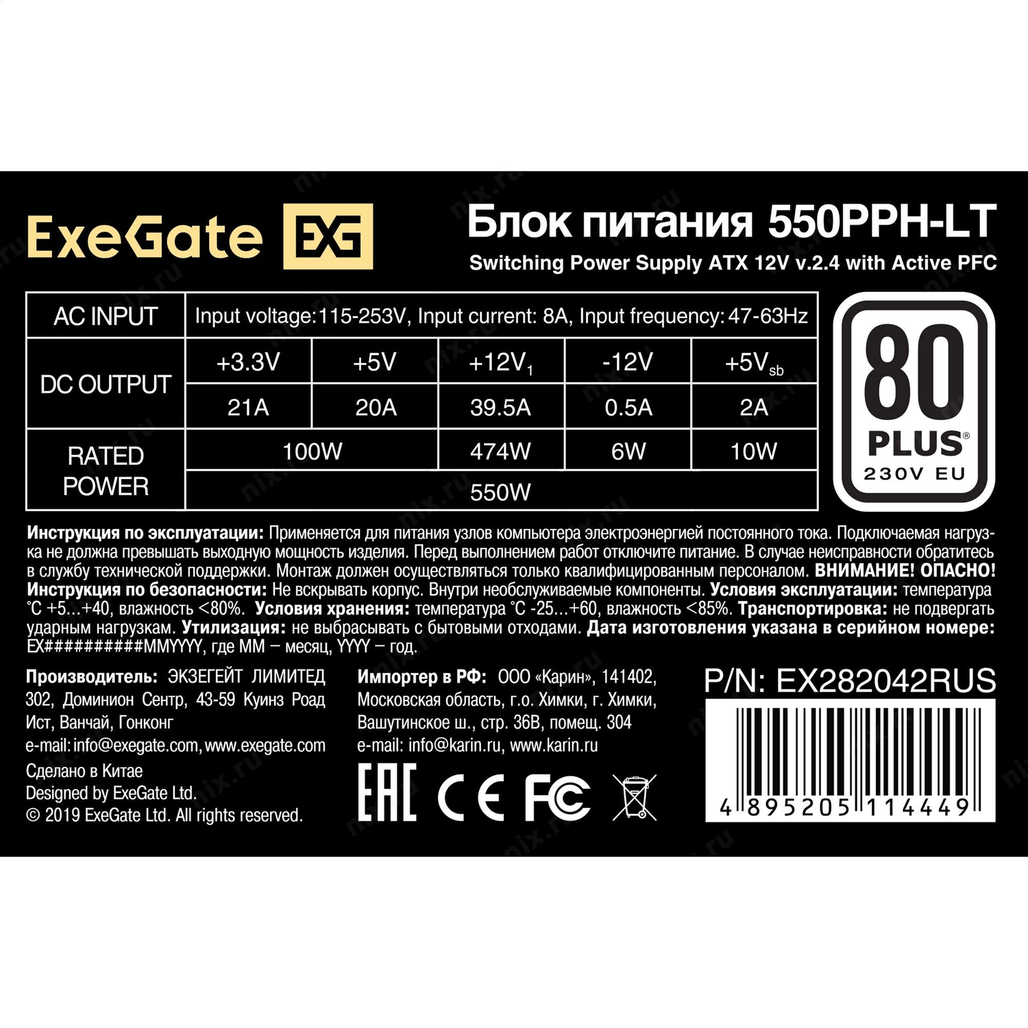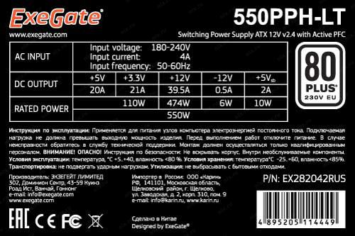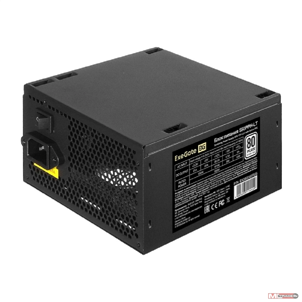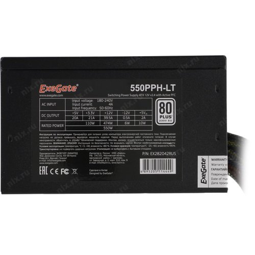 Блок питания Exegate EX282042RUS-OEM Блок питания 550W Exegate 550PPH-LT-OEM, 80+, ATX, black, APFC, 12cm, 24p, (4+4)p, 5*SATA, 3*IDE