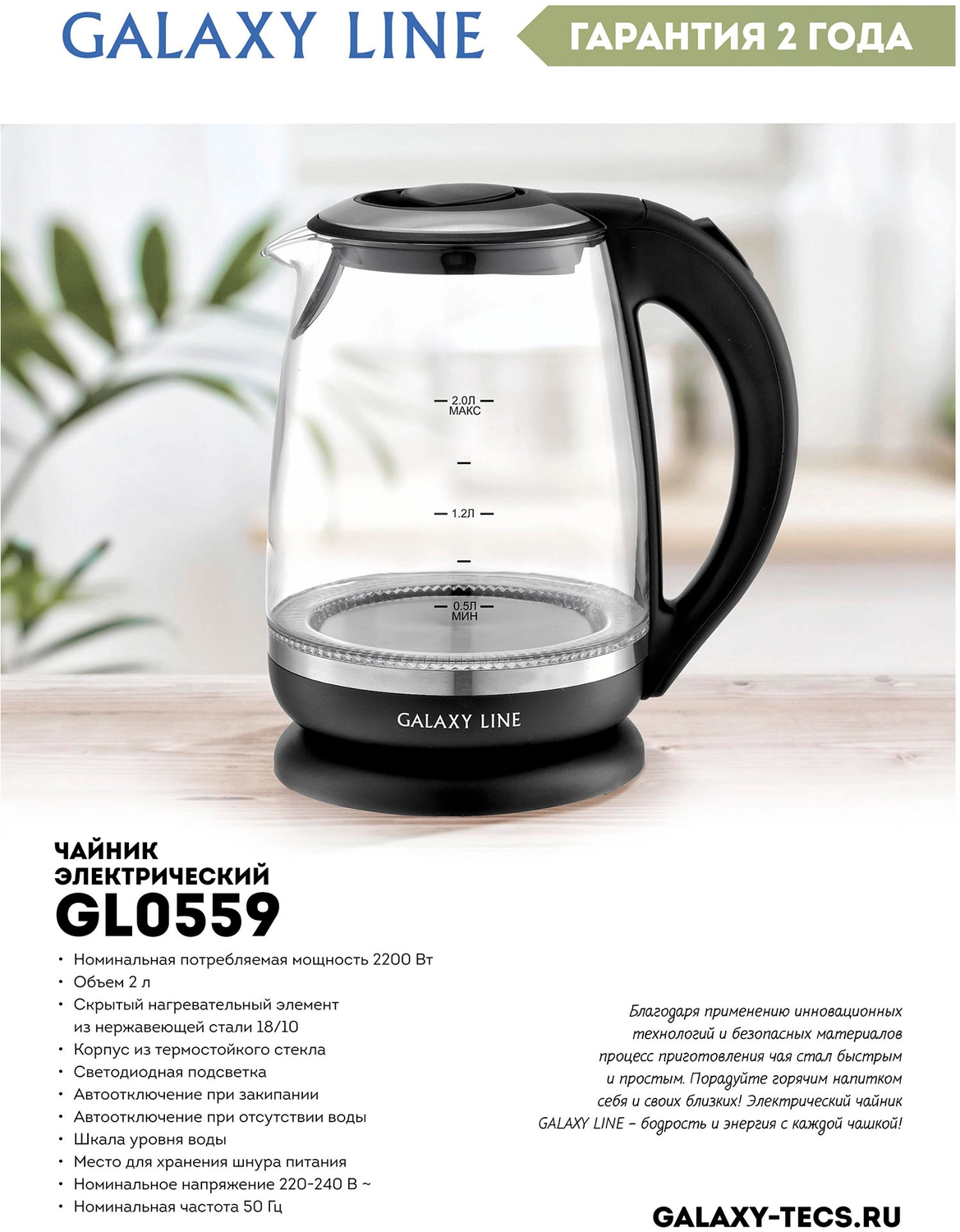 Чайник электрический Galaxy Line GL 0559 2л. 2200Вт черный корпус: стекло (ГЛ0559Л)
