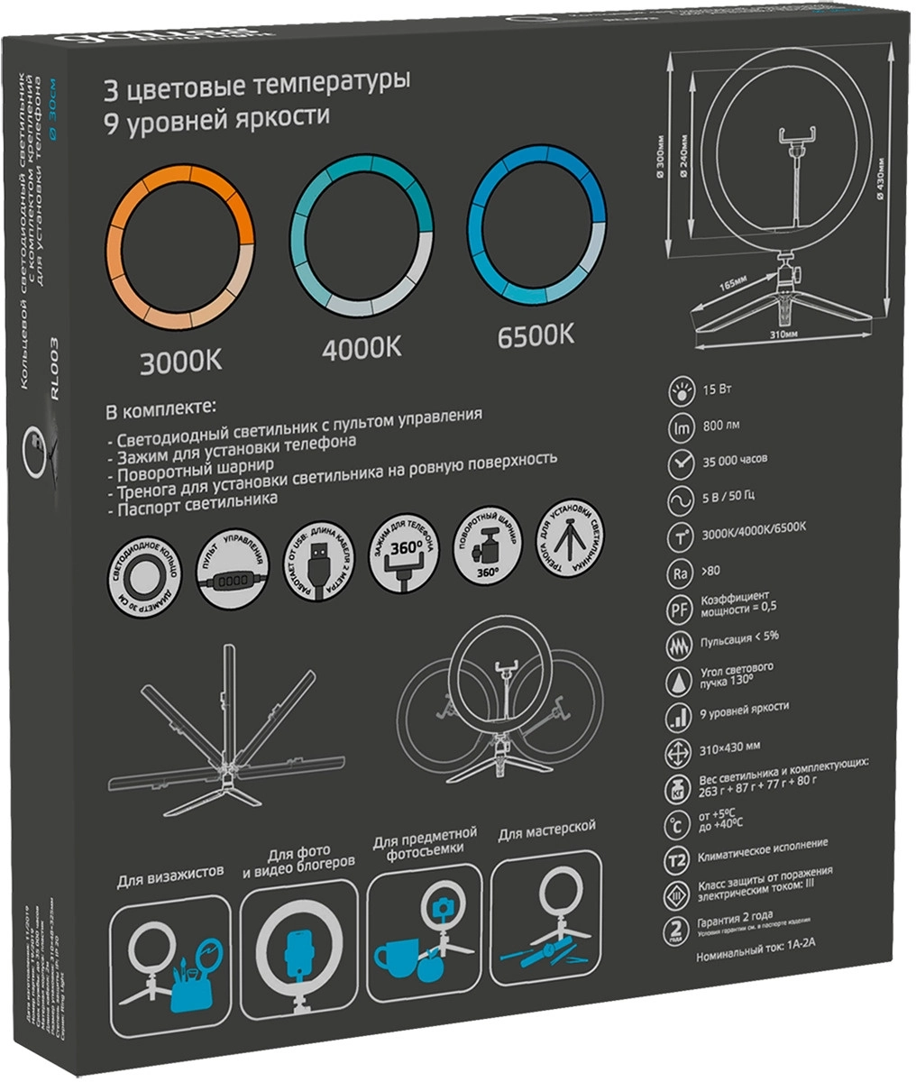 Светильник, зажим для смартфона, тренога, паспорт светильника