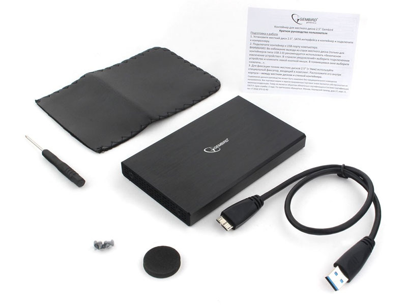 Контейнер, Кабель USB 3.0, Чехол, Отвёртка, Крепёжные винты, Краткое руководство пользователя