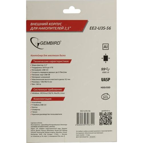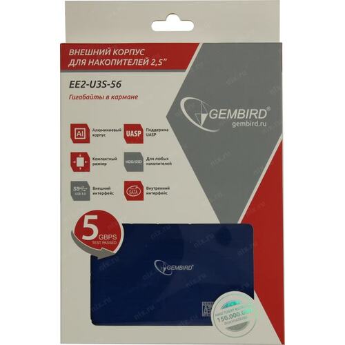 Контейнер для HDD Gembird EE2-U3S-56 Внешний корпус 2.5" синий металлик, USB 3.0, SATA, алюминий