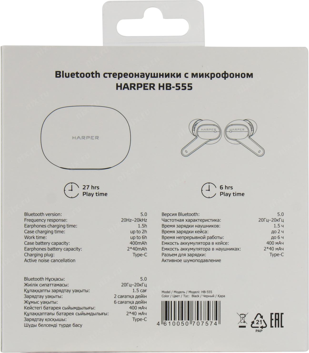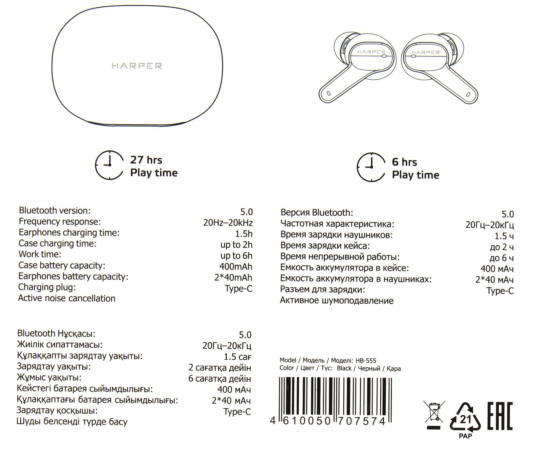 Наушники с микрофоном HARPER HB-555 Black (Bluetooth 5.0)