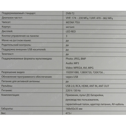 Full HD плеер со встроенным DVB-T/DVB-T2 тюнером, использующий приобретаемые отдельно внешние USB-накопители для хранения данных, с пультом ДУ в комплекте и русским меню.