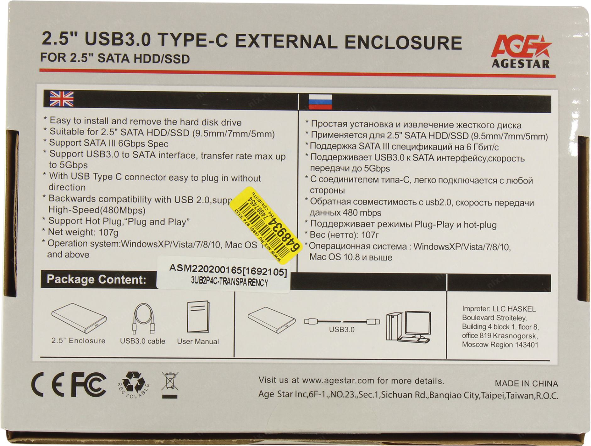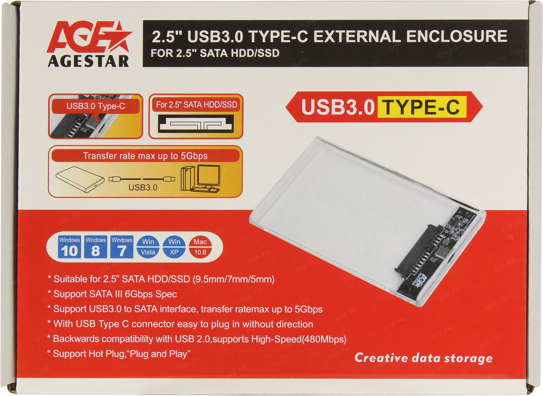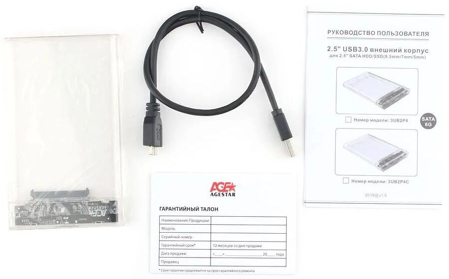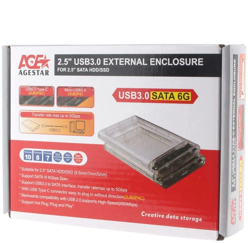 Внешний корпус для HDD/SSD AgeStar 3UB2P4C SATA III USB3.0 пластик прозрачный 2.5"