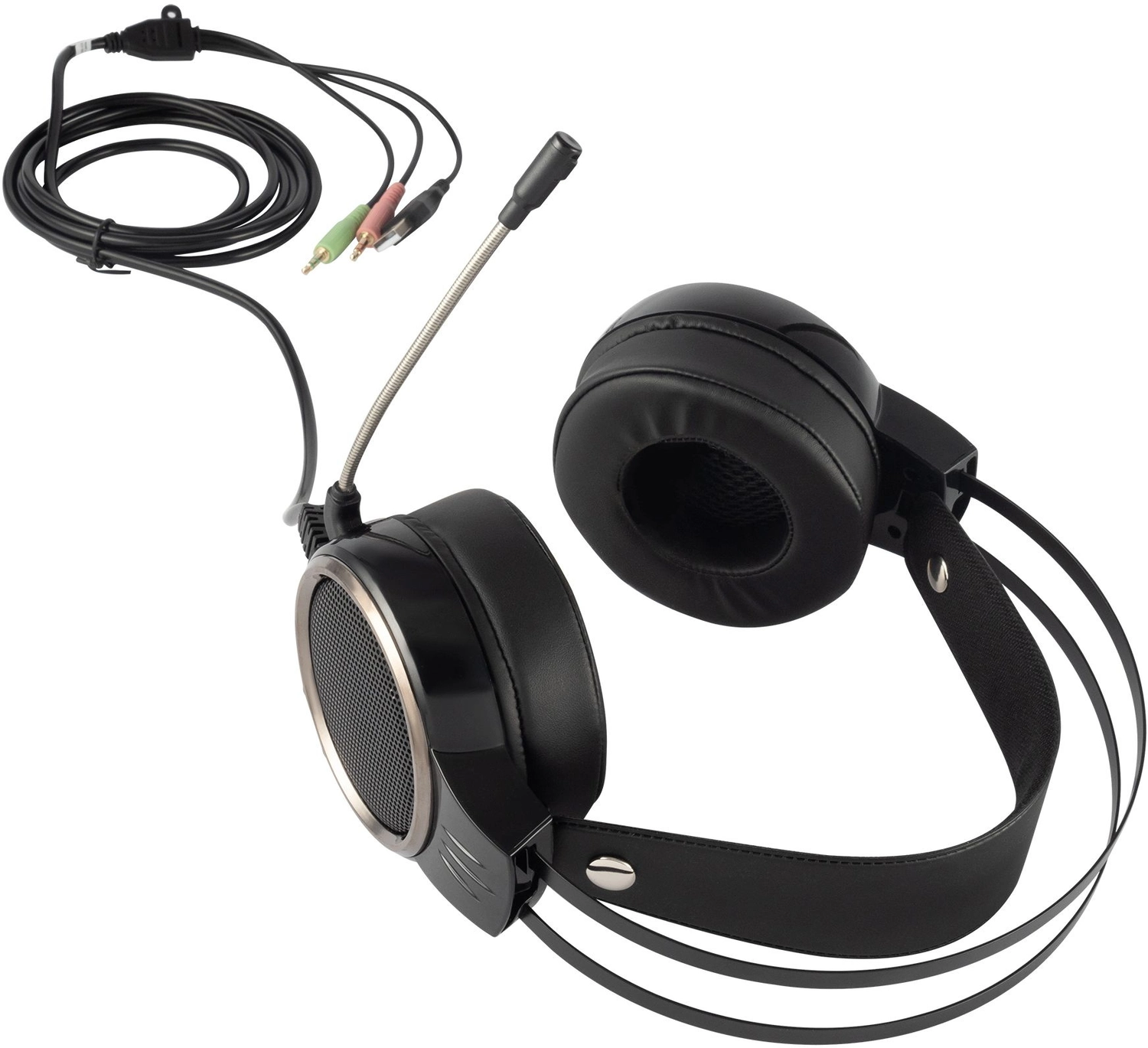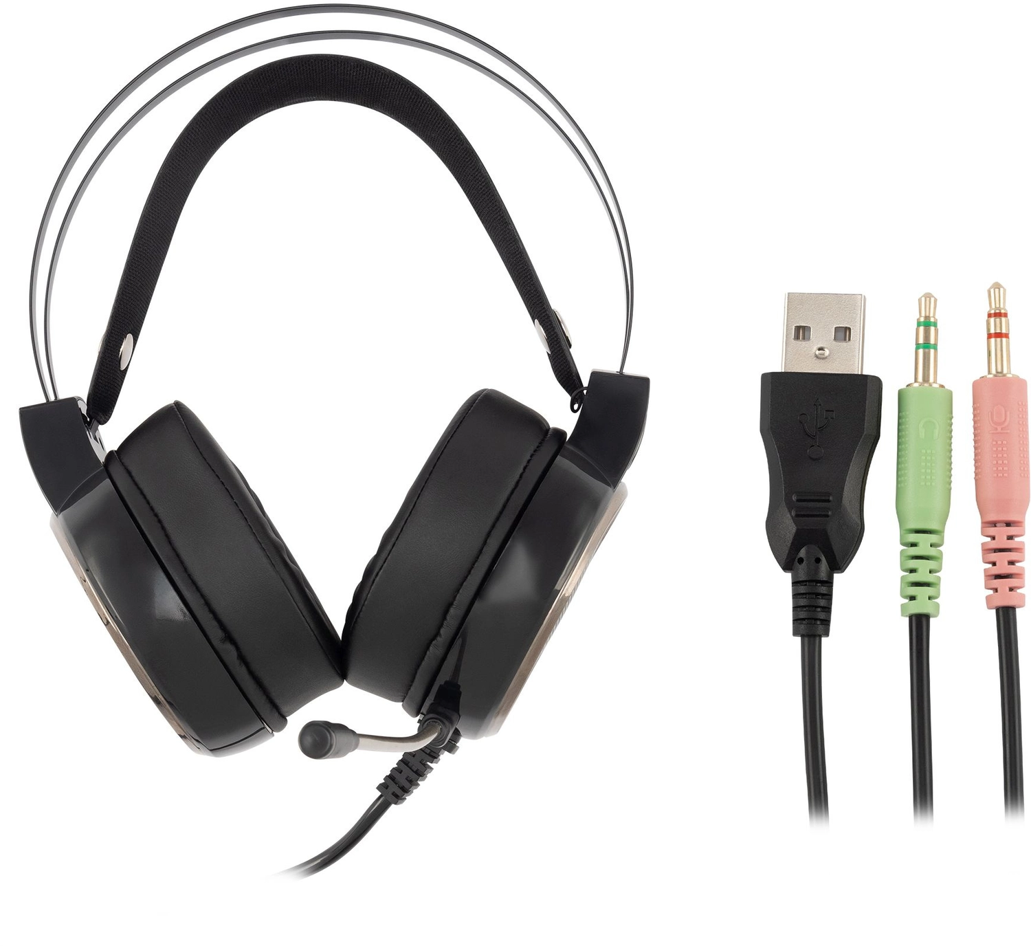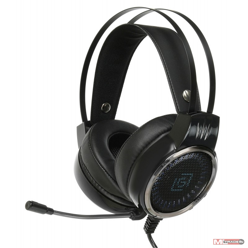 Игровая компьютерная гарнитура со стильной подсветкой, адаптивным оголовьем, мягкими амбушюрами из искусственной кожи. Микрофон на гибкой ножке. Длинный провод позволяет комфортно расположиться не завися от системного блока. Позолоченные коннекторы.