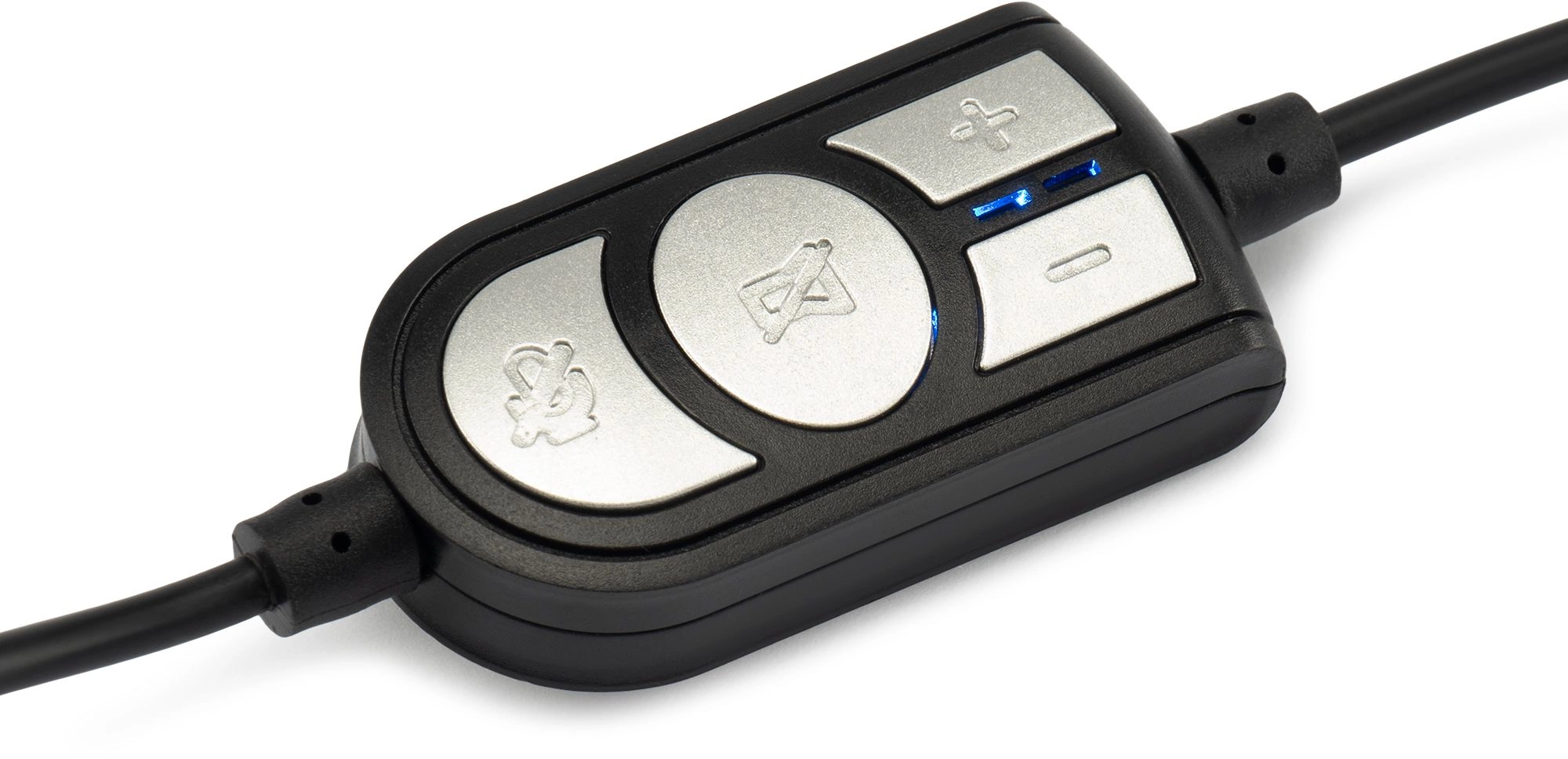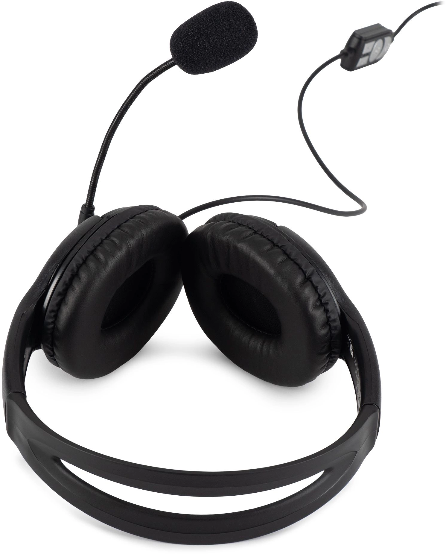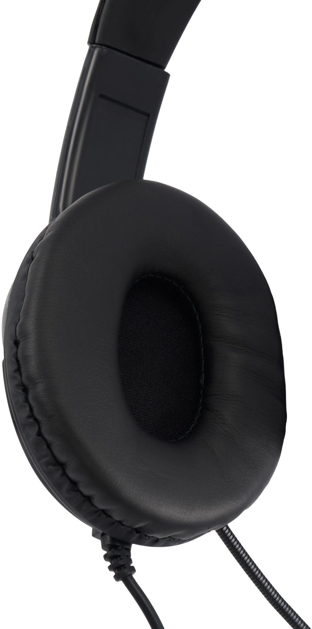 Универсальная компьютерная гарнитура, адаптивное оголовье, мягкие закрытые амбушюры, поворотный микрофон на гибкой ножке, на проводе - удобный контроллер громкости + функция Mute для микрофона.