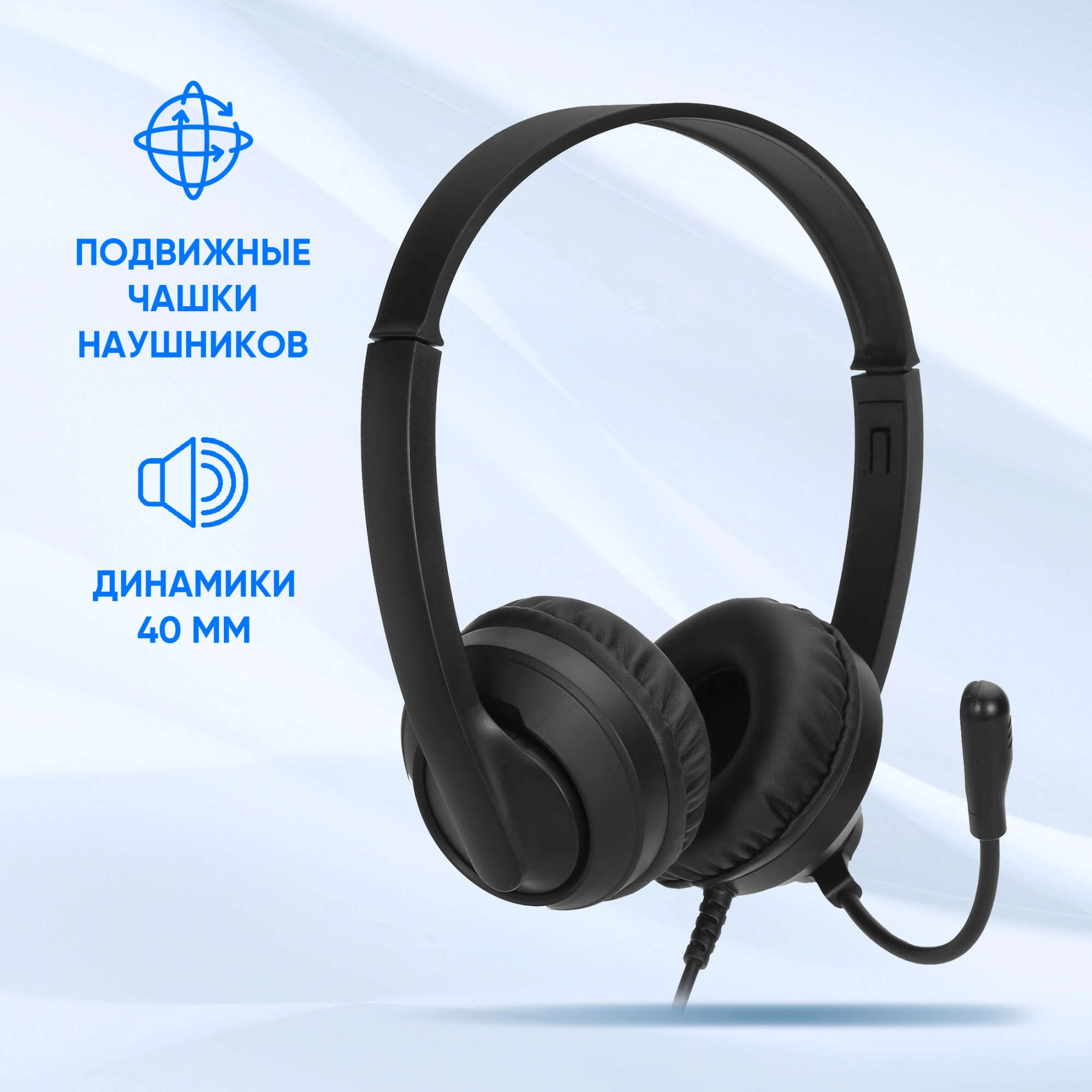Компьютерная гарнитура. ABS пластик. Регулируемое оголовье. Легкие. Микрофон на гибкой поворотной ножке, поворот на 270 градусов. Подключение - USB type A. На проводе контроллер вкл/выкл микрофона, регулировка громкости наушников. Поворотные чашки. Отлично подходит для длительного использования.