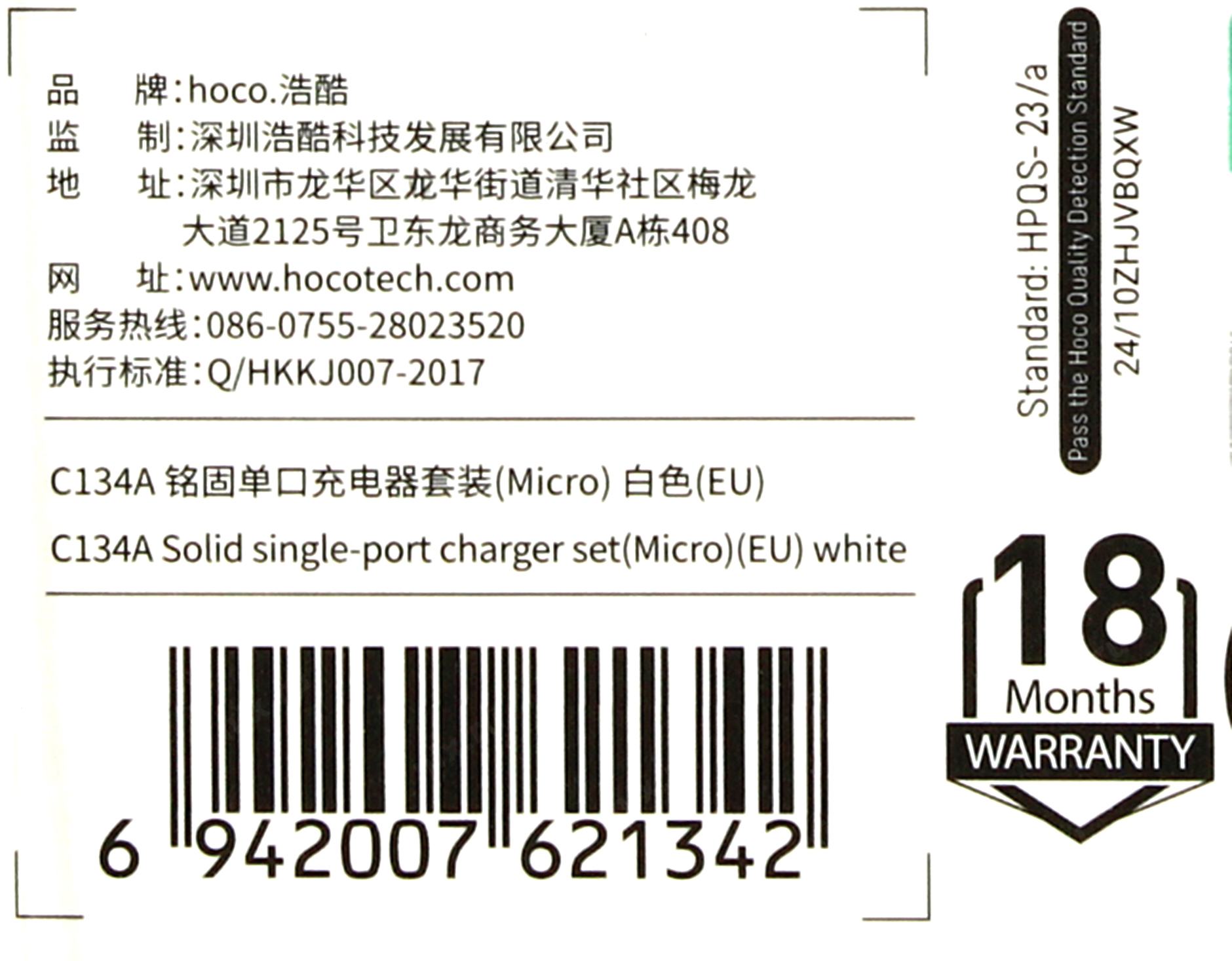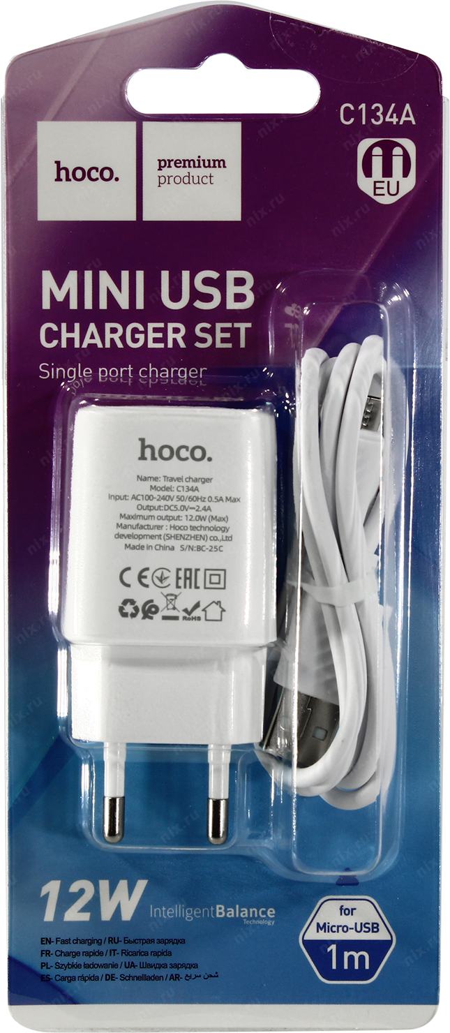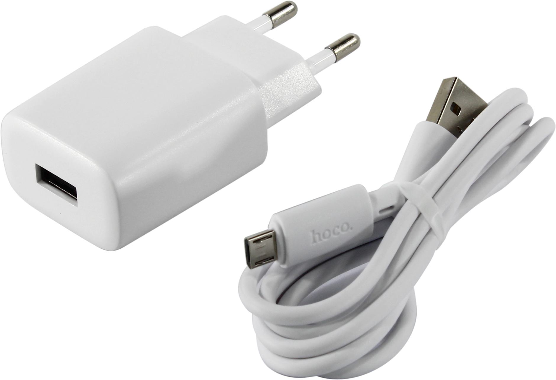 Hoco C134A Set Solid White < 621342> Зарядное устройство USB (Вых. DC5V, 12W, USB, Кабель microUSB)