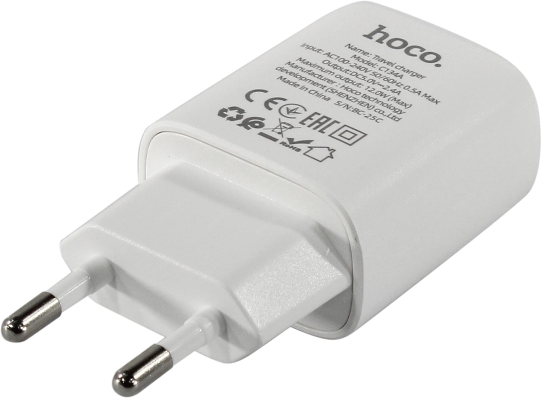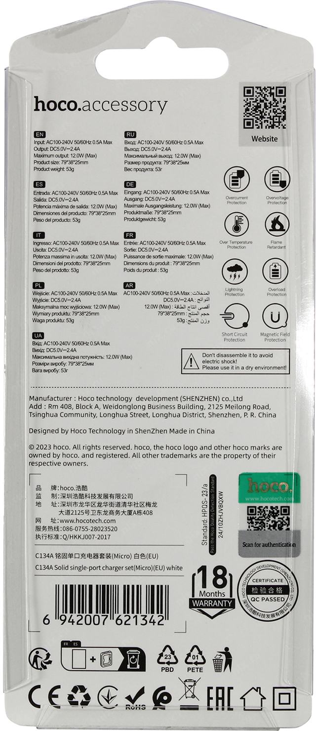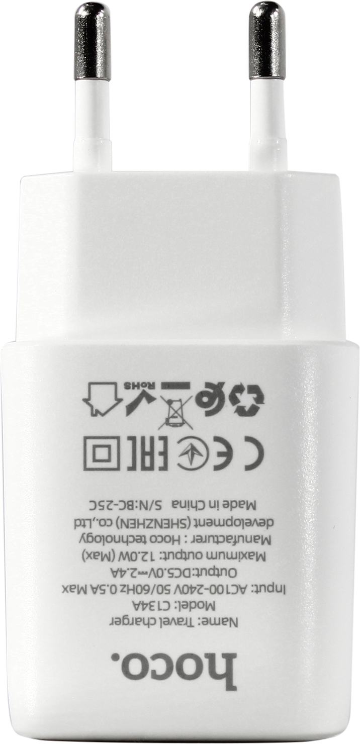 Hoco C134A Set Solid White < 621342> Зарядное устройство USB (Вых. DC5V, 12W, USB, Кабель microUSB)