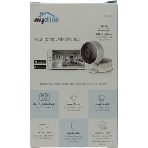 Цифровая камера видеонаблюдения с широкоугольным объективом (угол обзора 180°), поддержкой ночной съёмки, WiFi 802.11n (до 300 Мбит/с), Bluetooth 4.0, со слотом для карт памяти и поддержкой сервиса mydlink