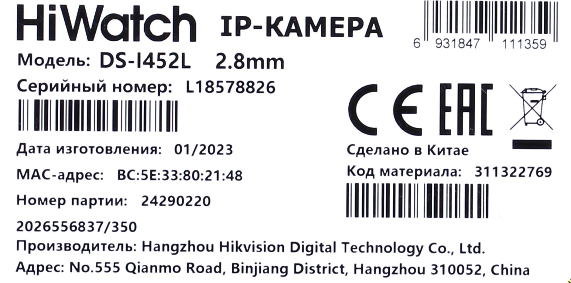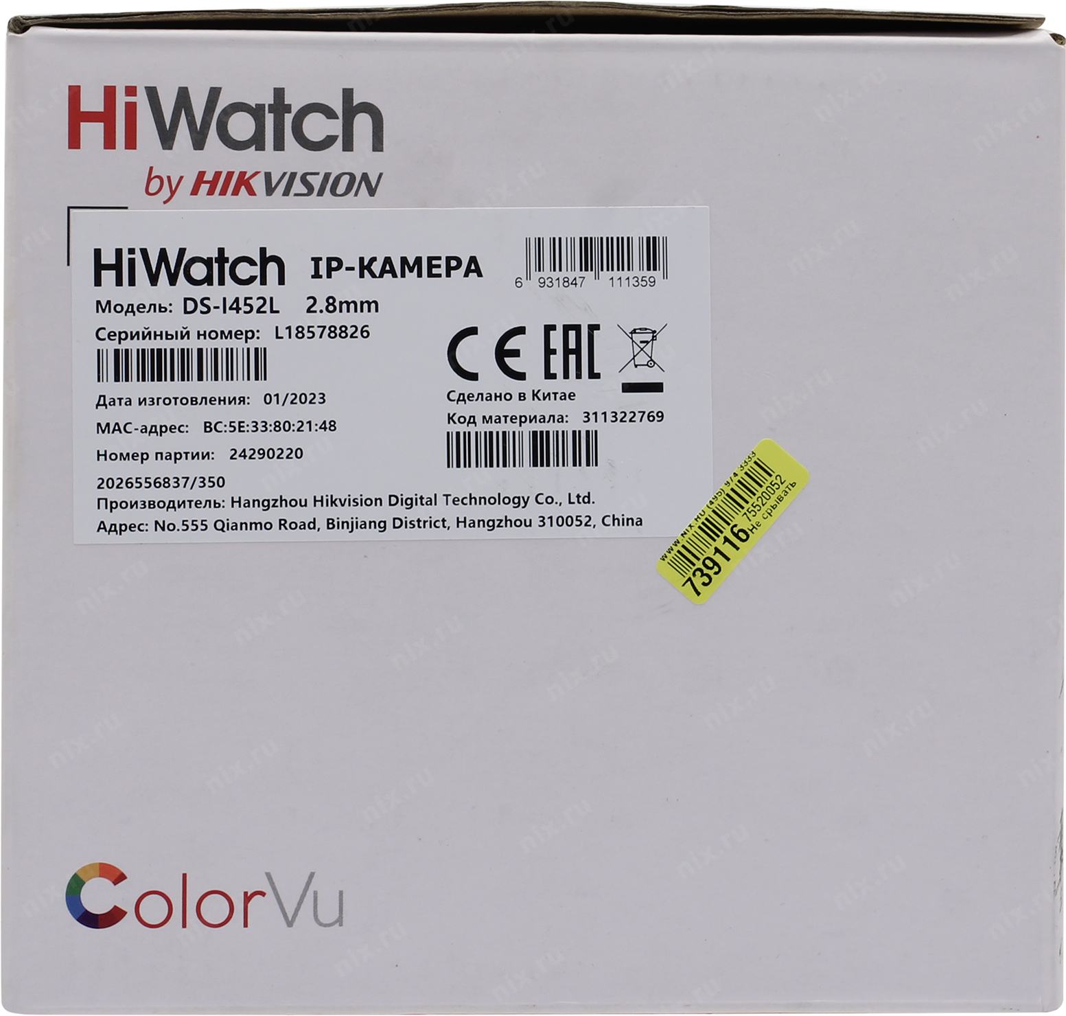 Камера видеонаблюдения IP HiWatch DS-I452L(B)(2.8mm) 2.8-2.8мм цв. корп.:белый