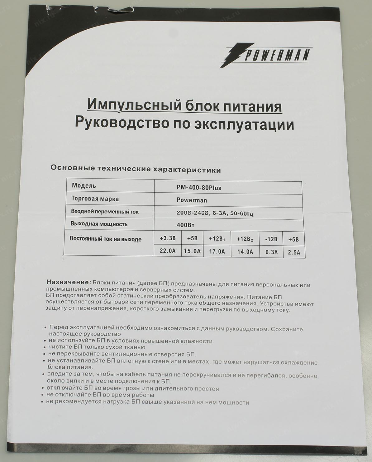 +3.3V - 15A, +5V - 15A, +12V - 24A, +5VSB - 2.5A, -12V - 0.5A;;; Комбинированная нагрузка: +3.3V & +5V - 100 Вт, +12V - 288 Вт