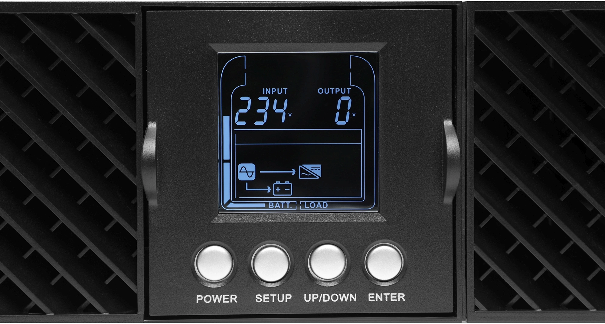 ЖКИ с подсветкой, отображающий цифровую величину входного и выходного напряжения, а также величину нагрузки и остаточной емкости батареи, пиктограммы индикации питания от сети, от батареи, режим регулятора.