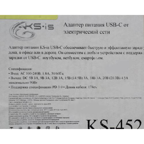 Аксессуар к ноутбуку KS-is KS-452 (Универсальный блок питания PD USB-C от эл. сети 90Вт)