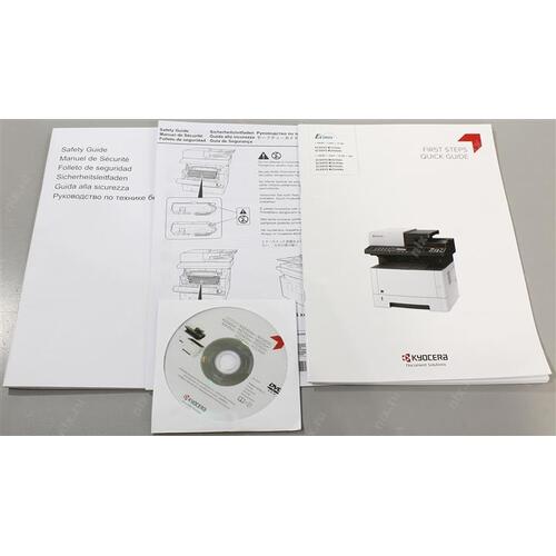 Диск с ПО, кабель питания, пробный картридж