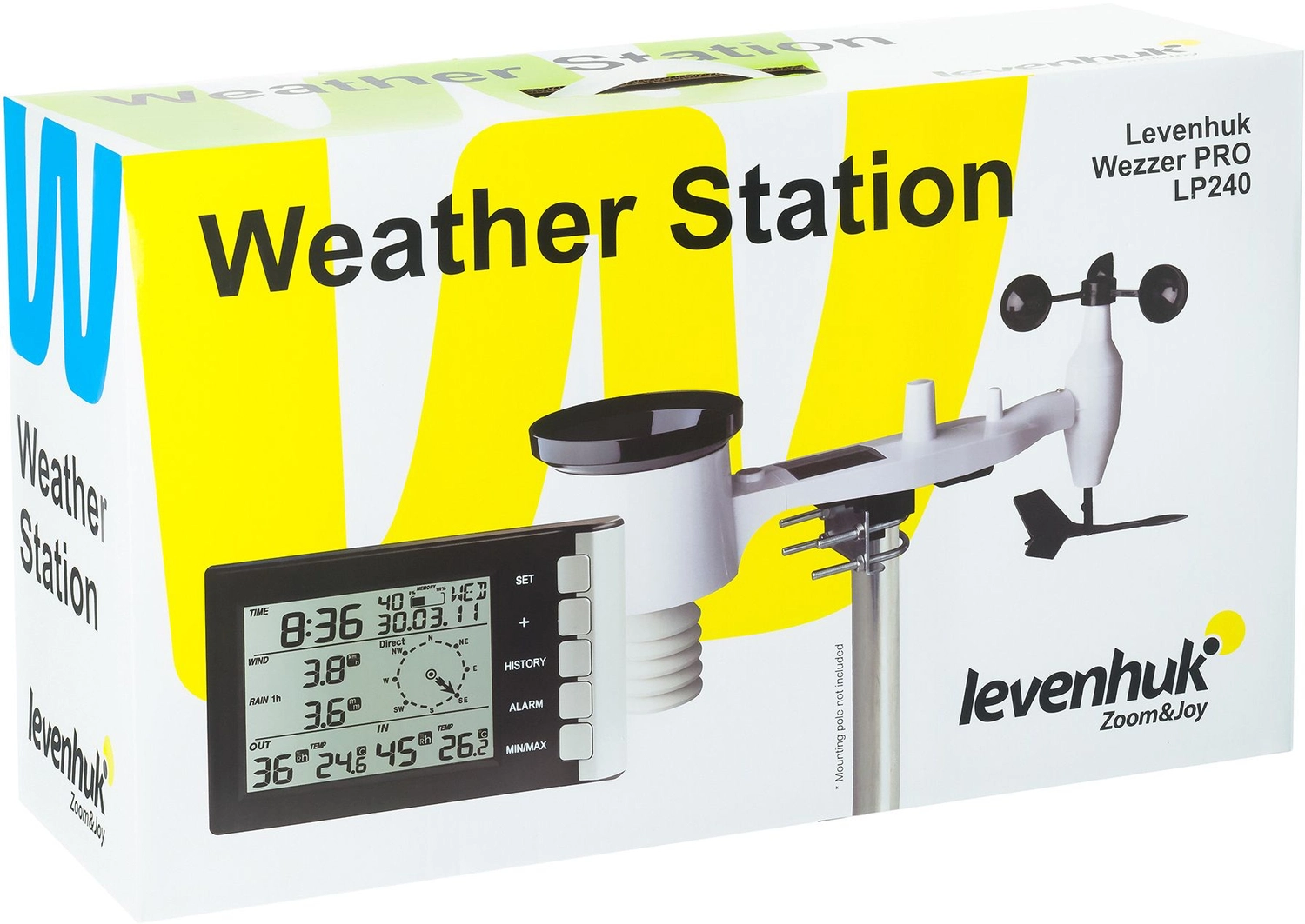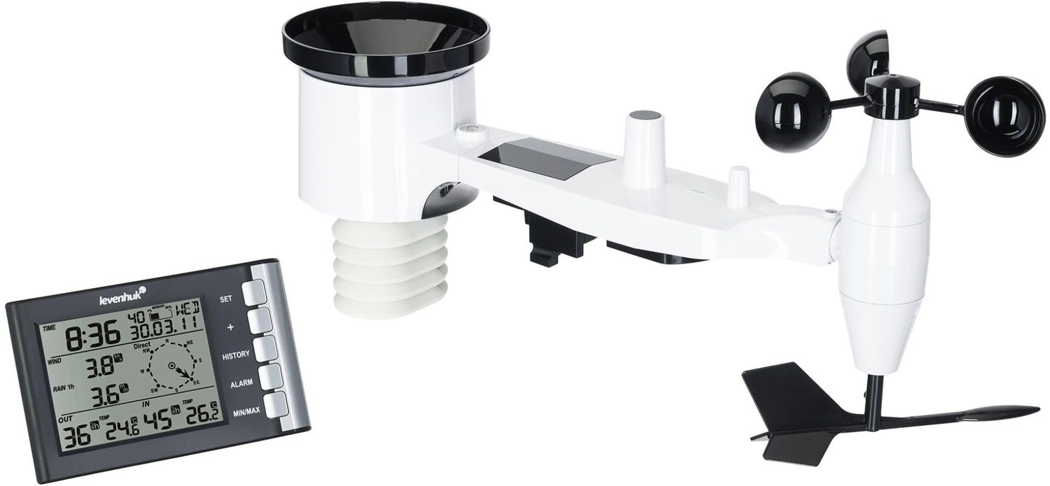 Метеостанция Levenhuk Wezzer PRO LP240 – это прибор профессионального уровня, предназначенный для измерения и архивации данных о погоде снаружи и микроклимате внутри помещения. За наружные измерения отвечает комплектный радиодатчик «5 в 1».