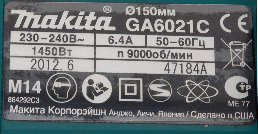 Углошлифовальная машина Makita GA6021C 1450Вт 9000об/мин рез.шпин.:M14 d=150мм