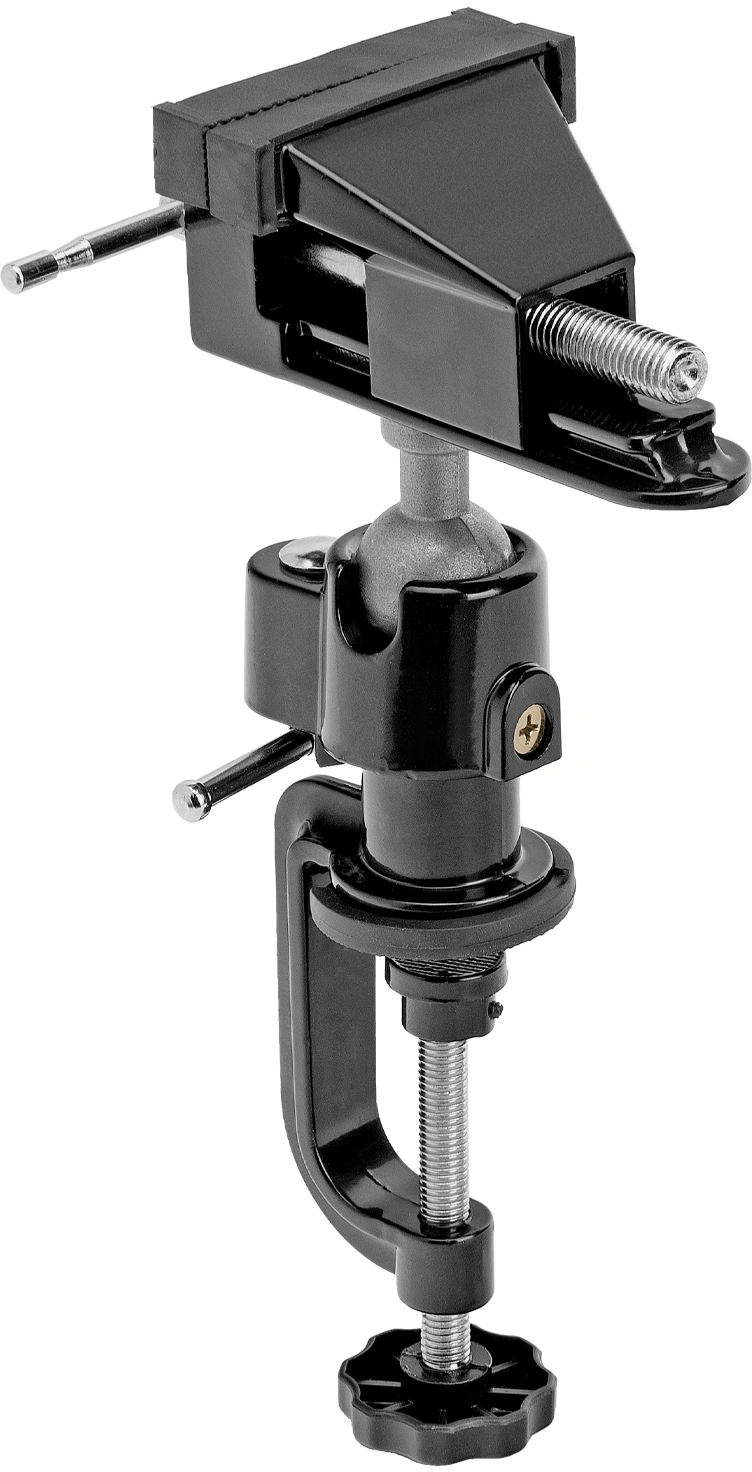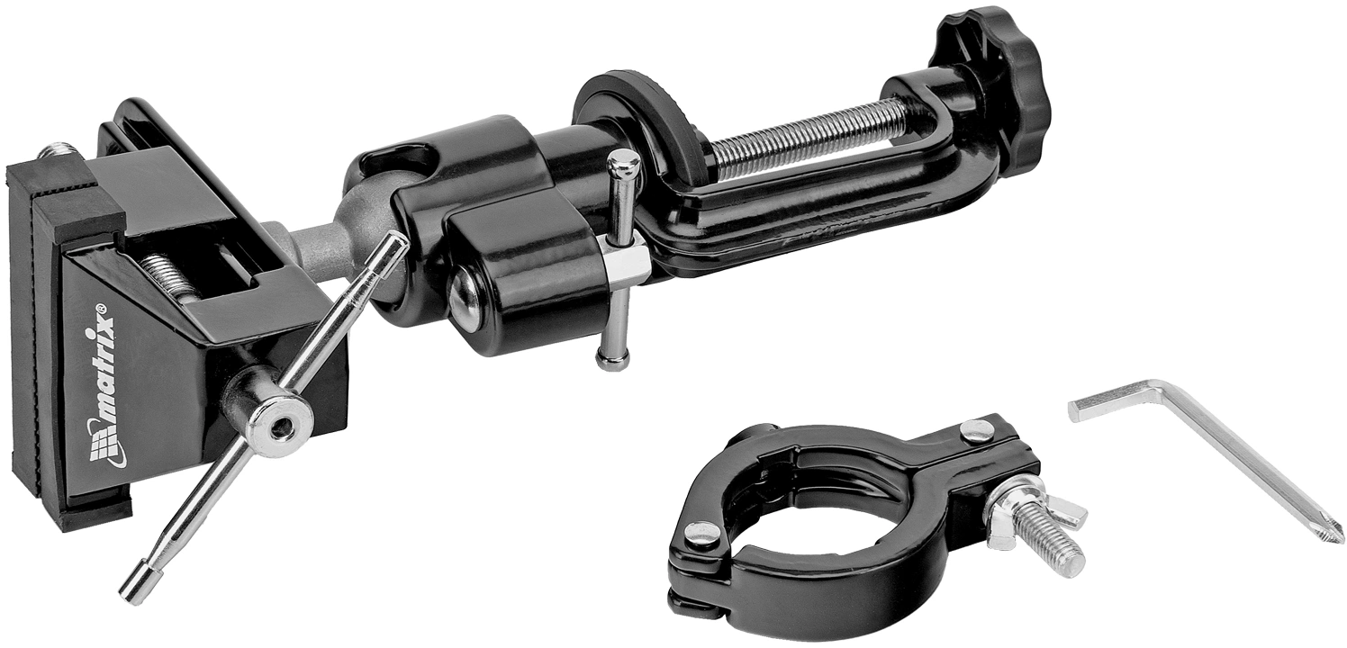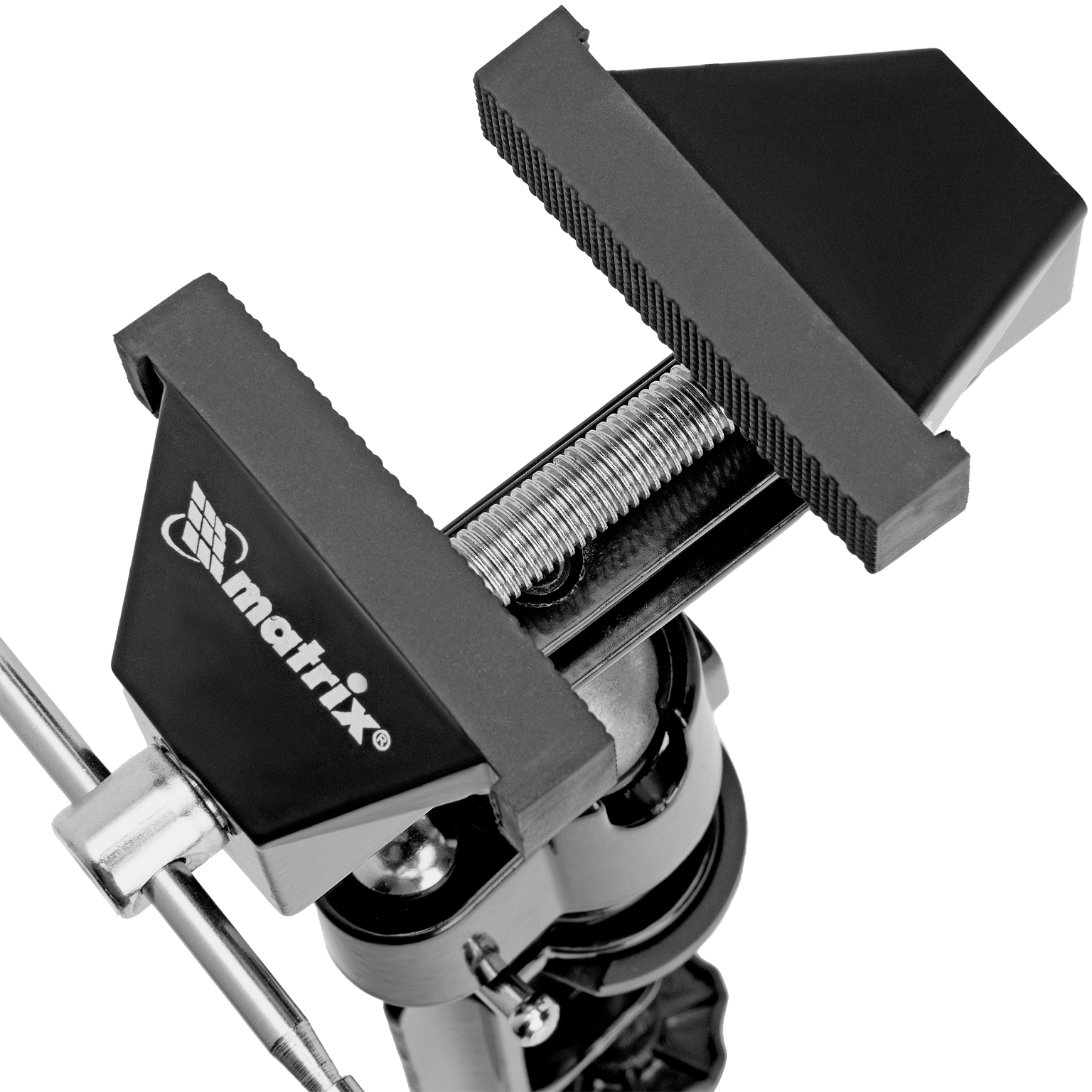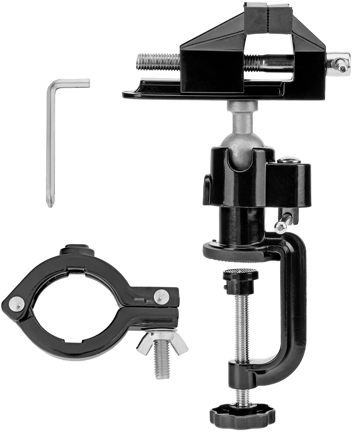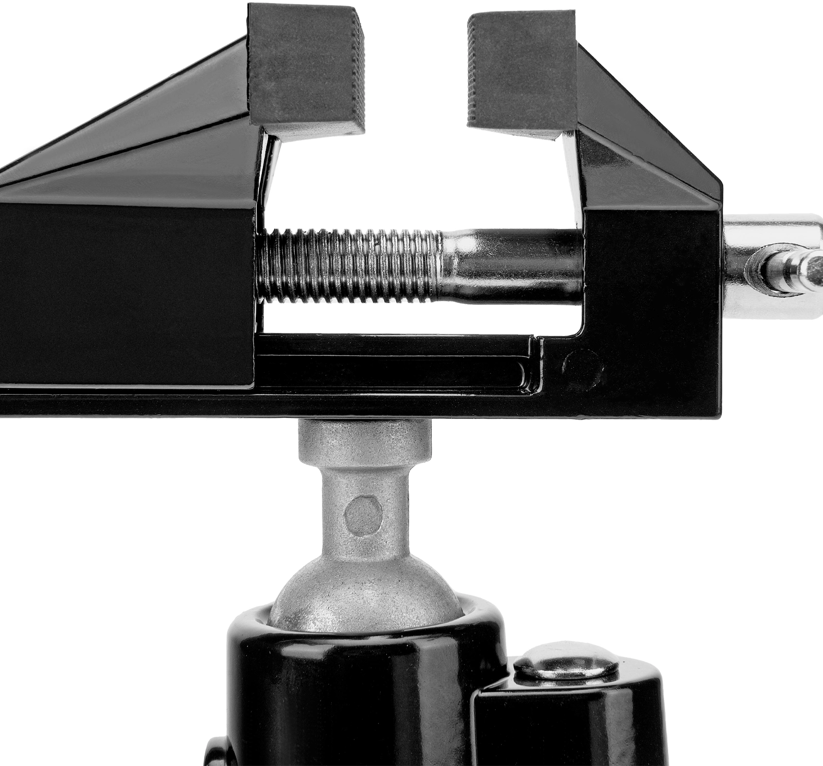 Зажимной хомут позволяет зафиксировать дрель для удобства сверления деталей. Шарнирный механизм позволяет вращать и наклонять верхнюю часть тисков, поэтому заготовку можно обрабатывать под разными углами.