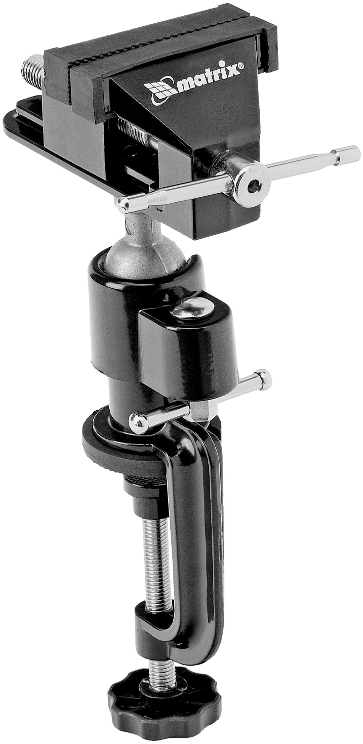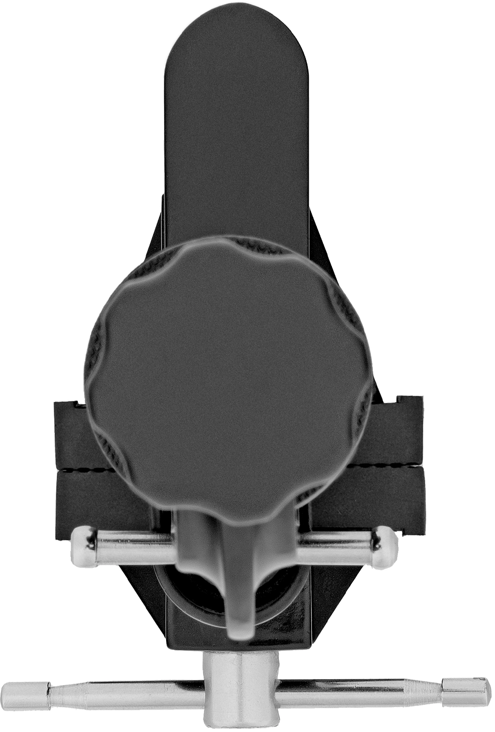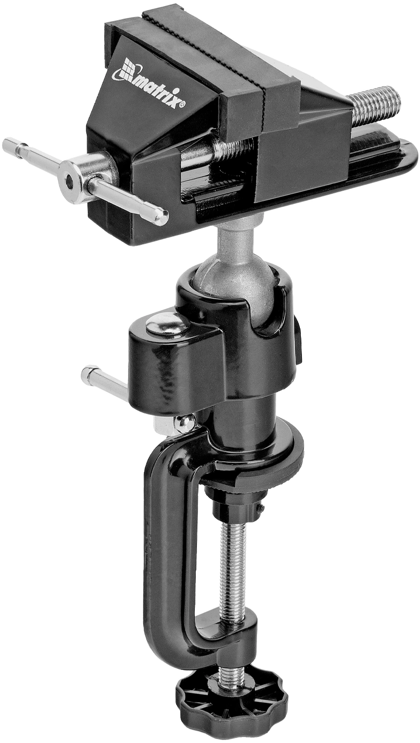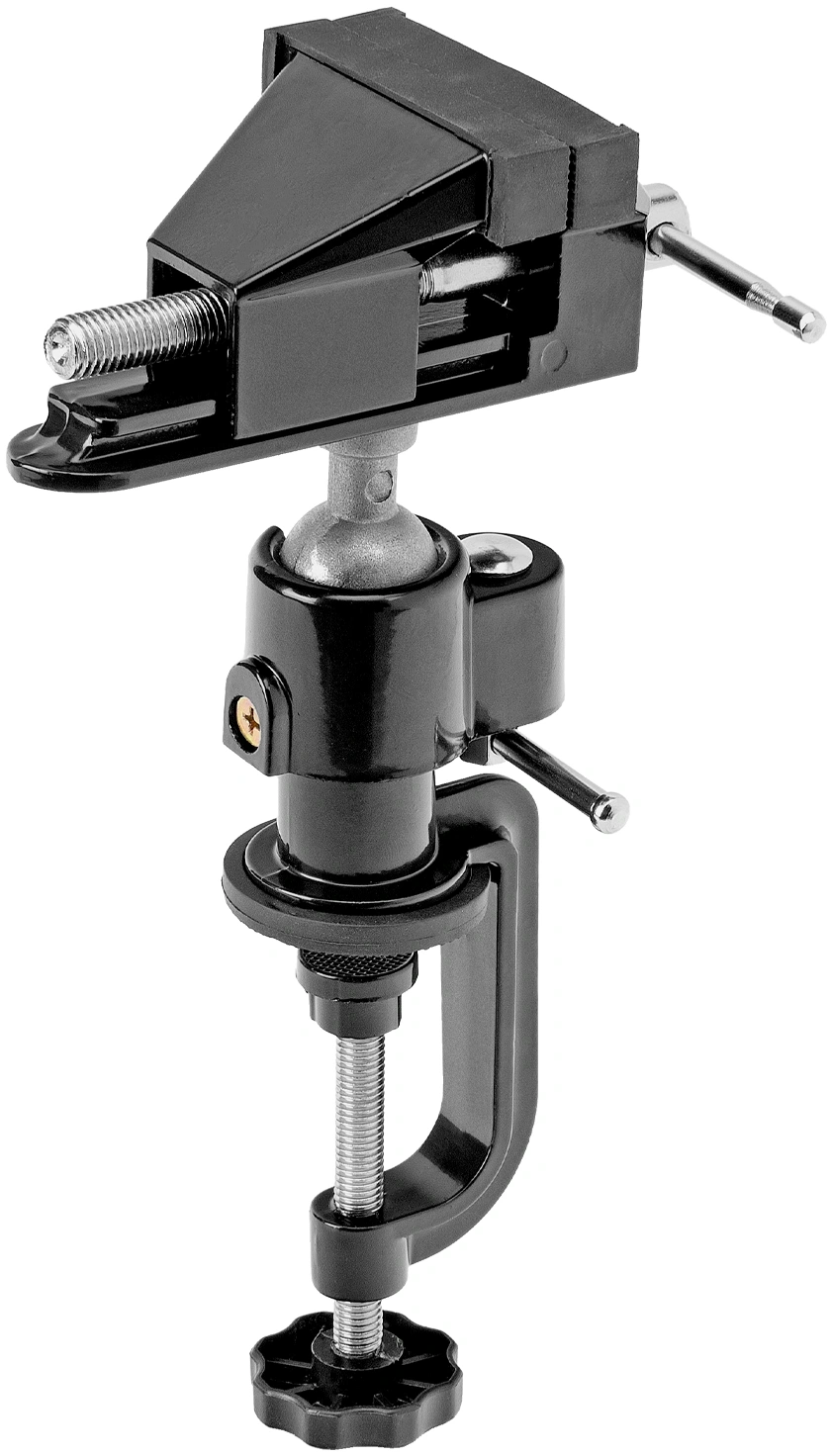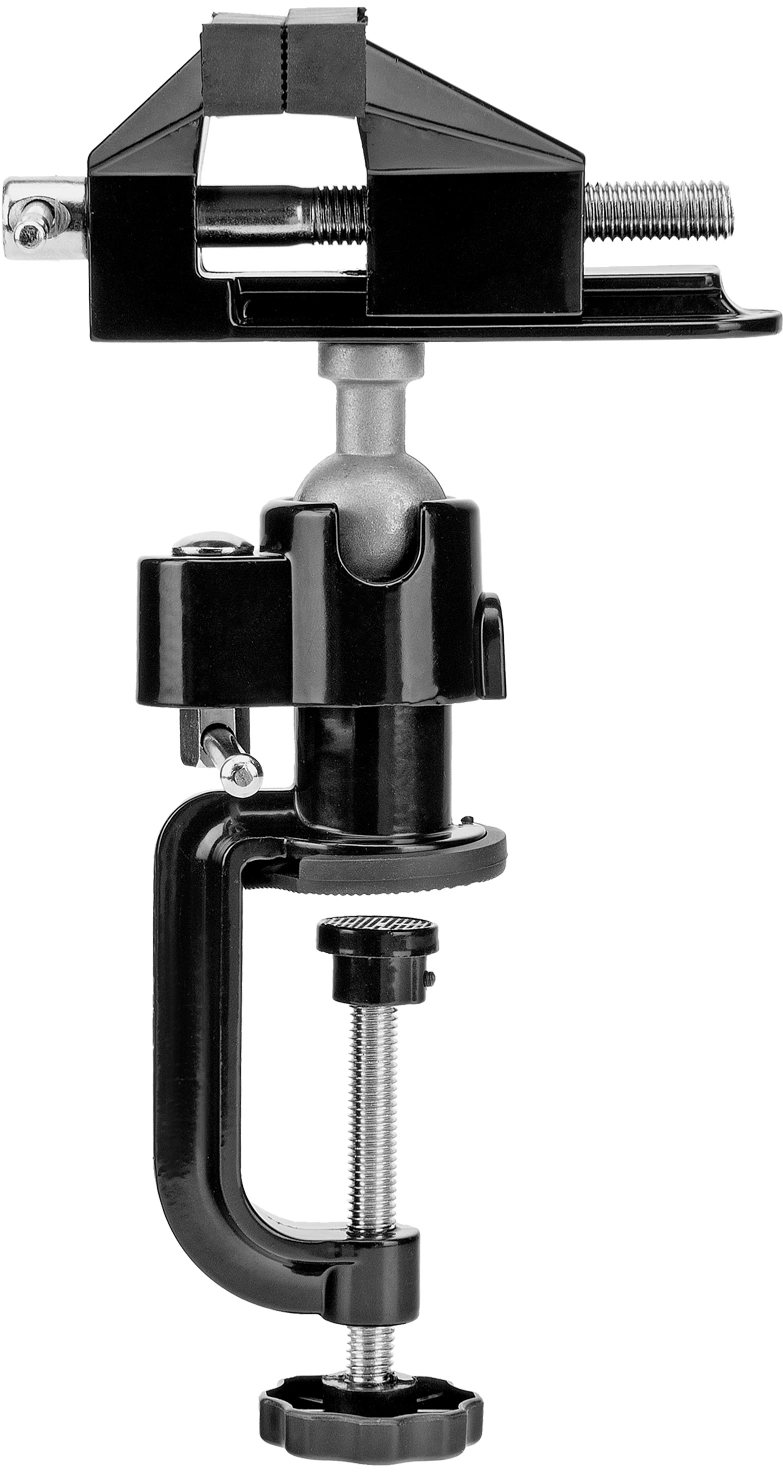 Зажимной хомут позволяет зафиксировать дрель для удобства сверления деталей. Шарнирный механизм позволяет вращать и наклонять верхнюю часть тисков, поэтому заготовку можно обрабатывать под разными углами.