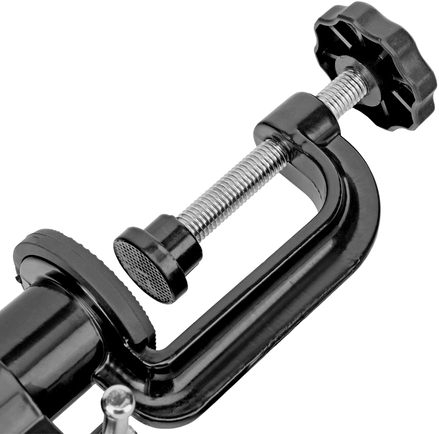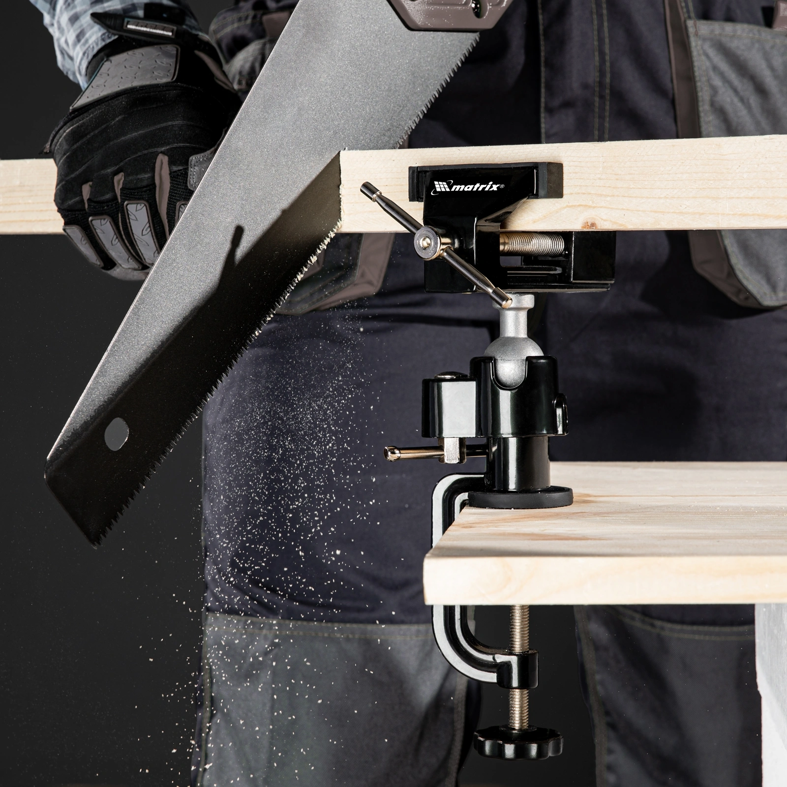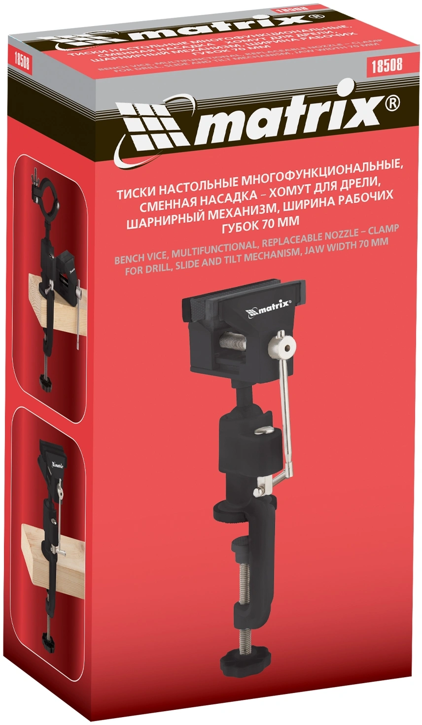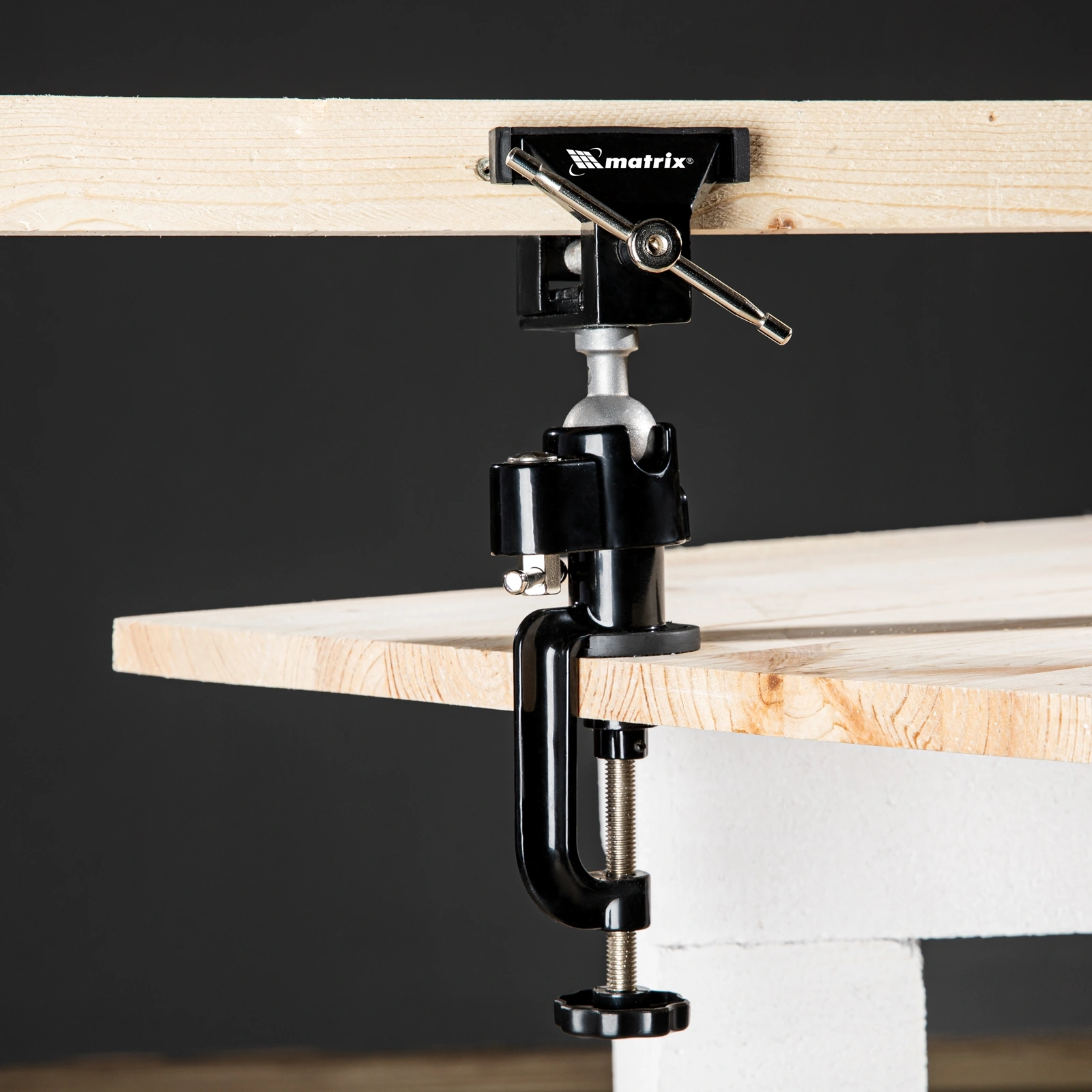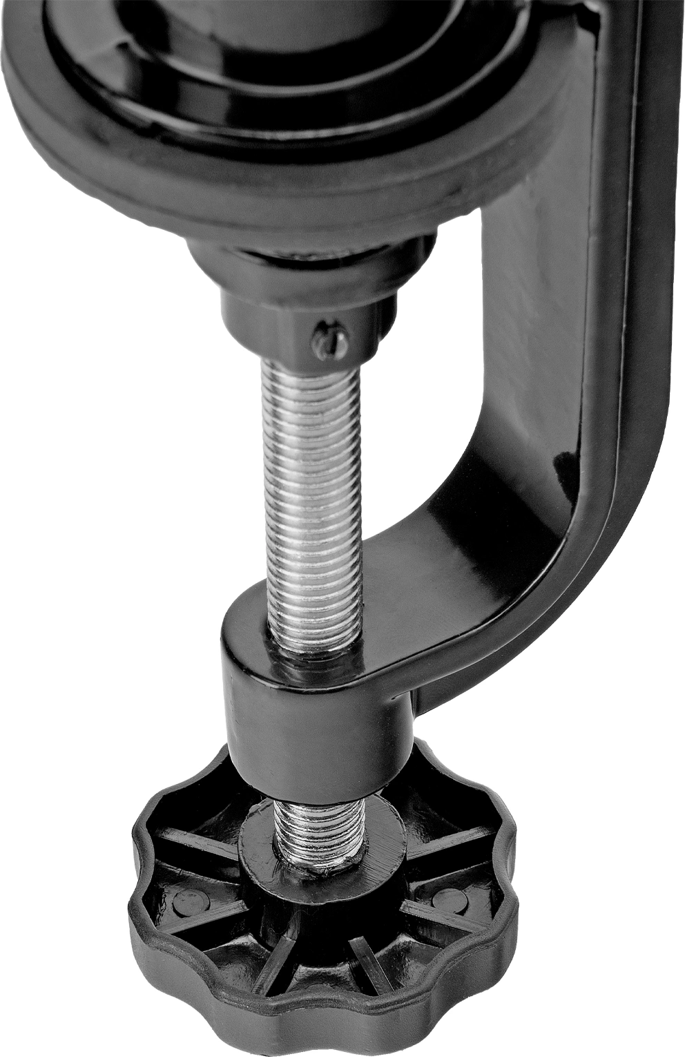 Зажимной хомут позволяет зафиксировать дрель для удобства сверления деталей. Шарнирный механизм позволяет вращать и наклонять верхнюю часть тисков, поэтому заготовку можно обрабатывать под разными углами.