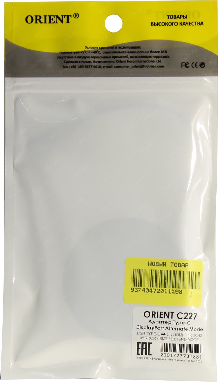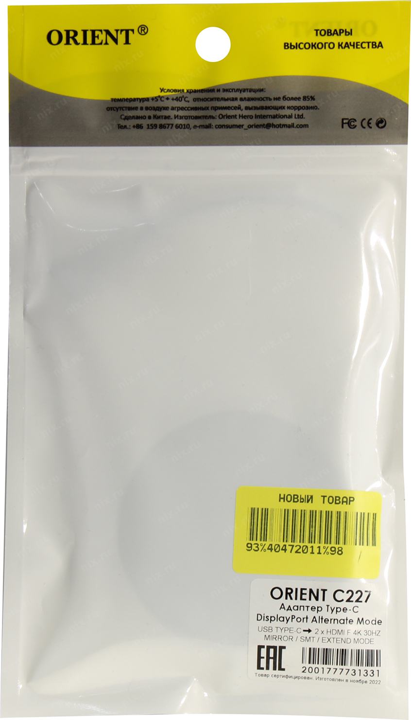 Orient <C227> Кабель-адаптер USB-C -> 2xHDMI (F)