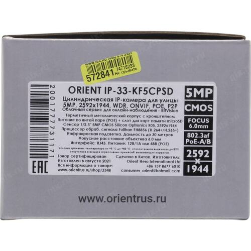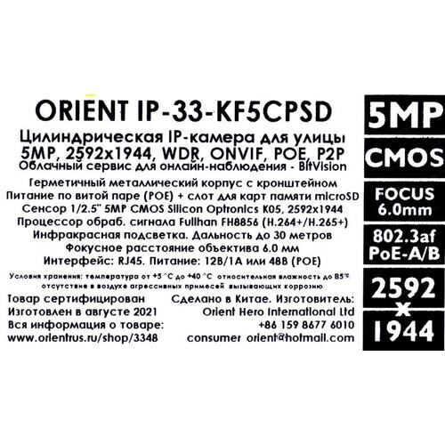 Видеокамера Orient <IP-33-KF5CPSD> (2592x1944, f= 6mm, 1UTP 100Mbps PoE, microSDXC, LED)