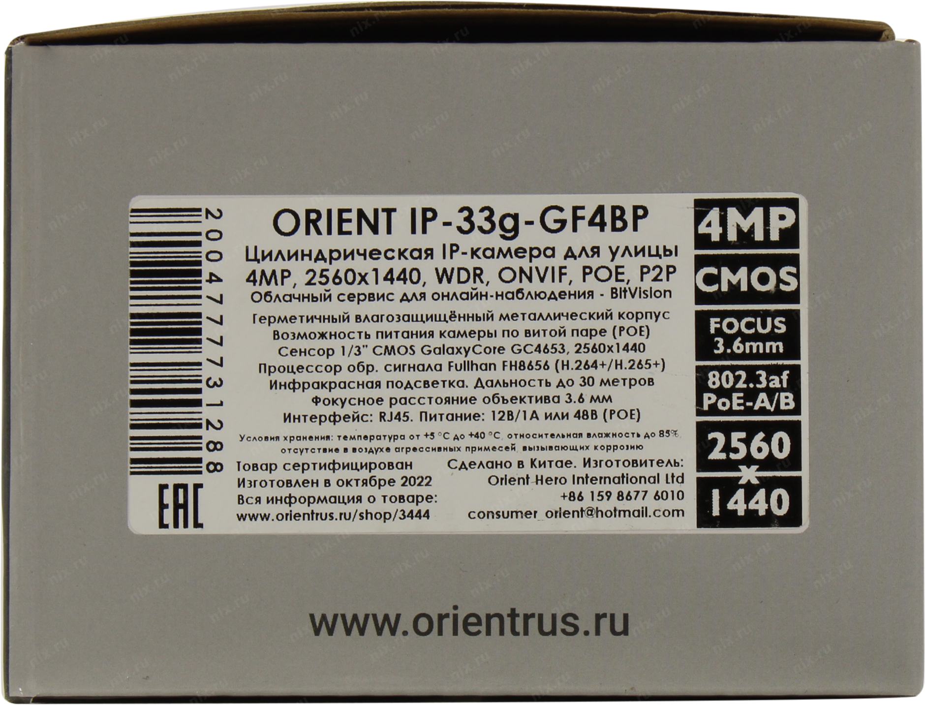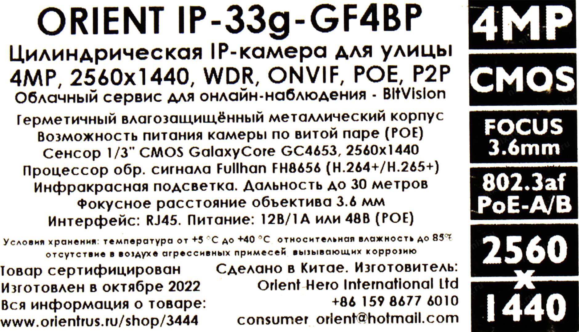 Видеокамера Orient <IP-33g-GF4BP> (2560x1440, f=3.6mm, 1UTP 100Mbps PoE, LED)