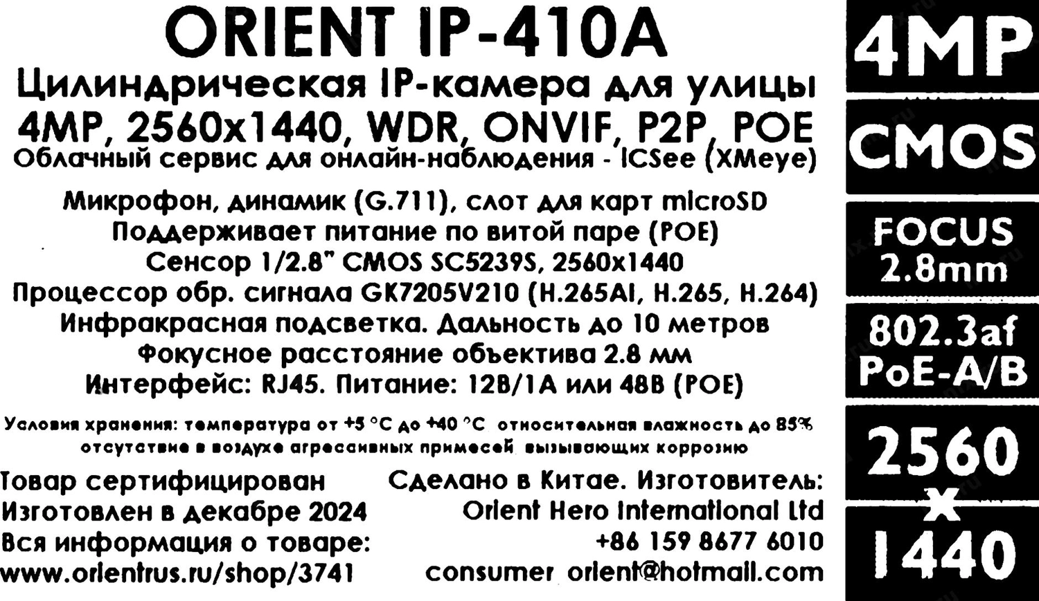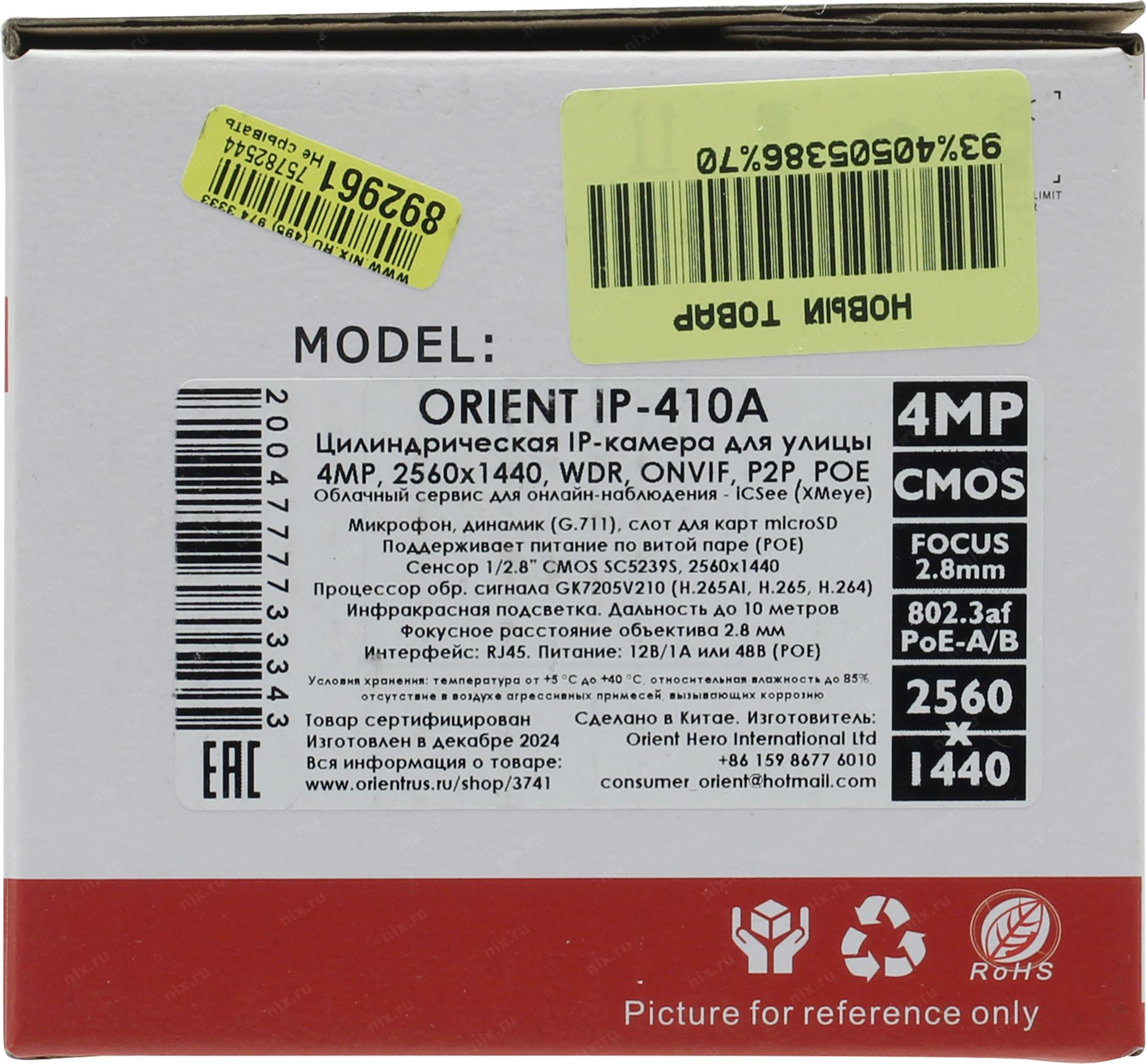 Видеокамера Orient <IP-410A> (2560x1440, f=2.8mm, 1UTP 100Mbps PoE, microSD, микрофон)