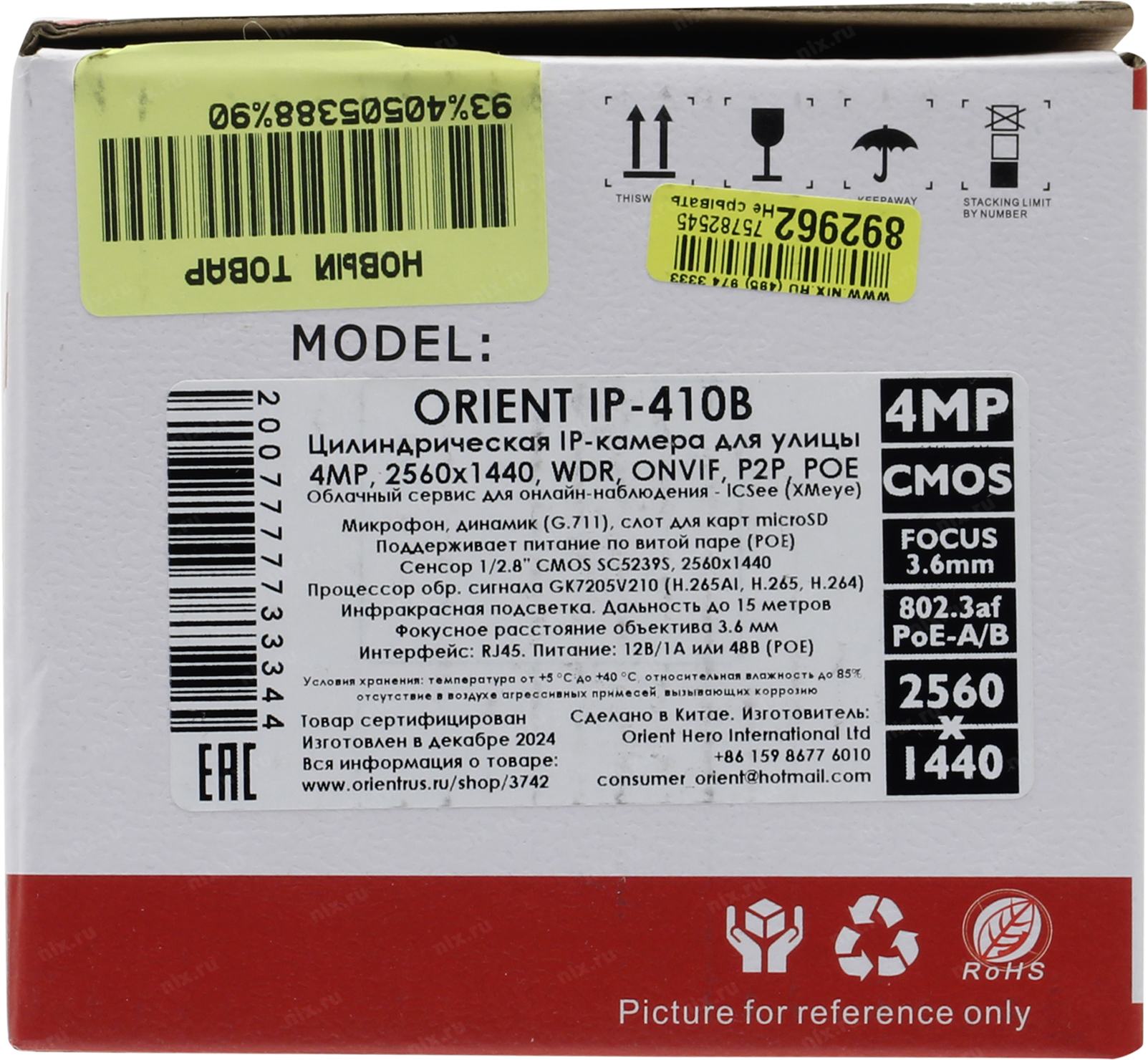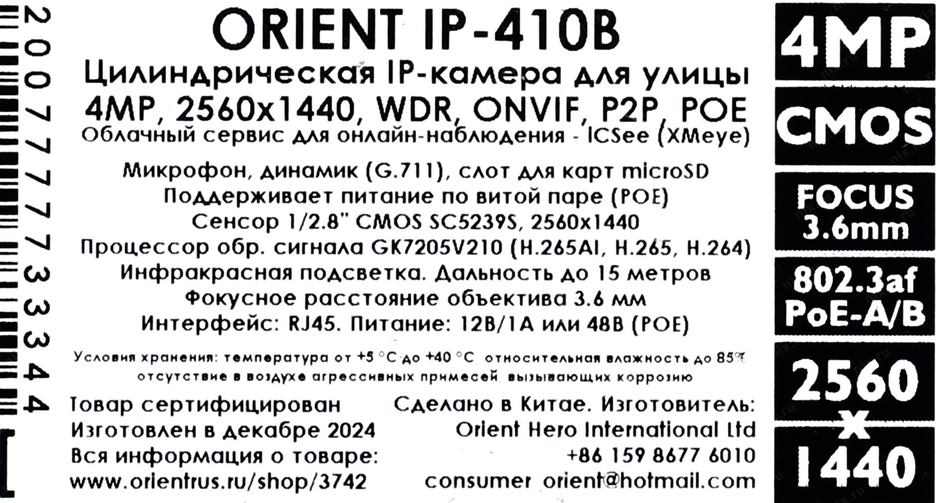 Видеокамера Orient <IP-410B> (2560x1440, f=3.6mm, 1UTP 100Mbps PoE, microSD, микрофон)
