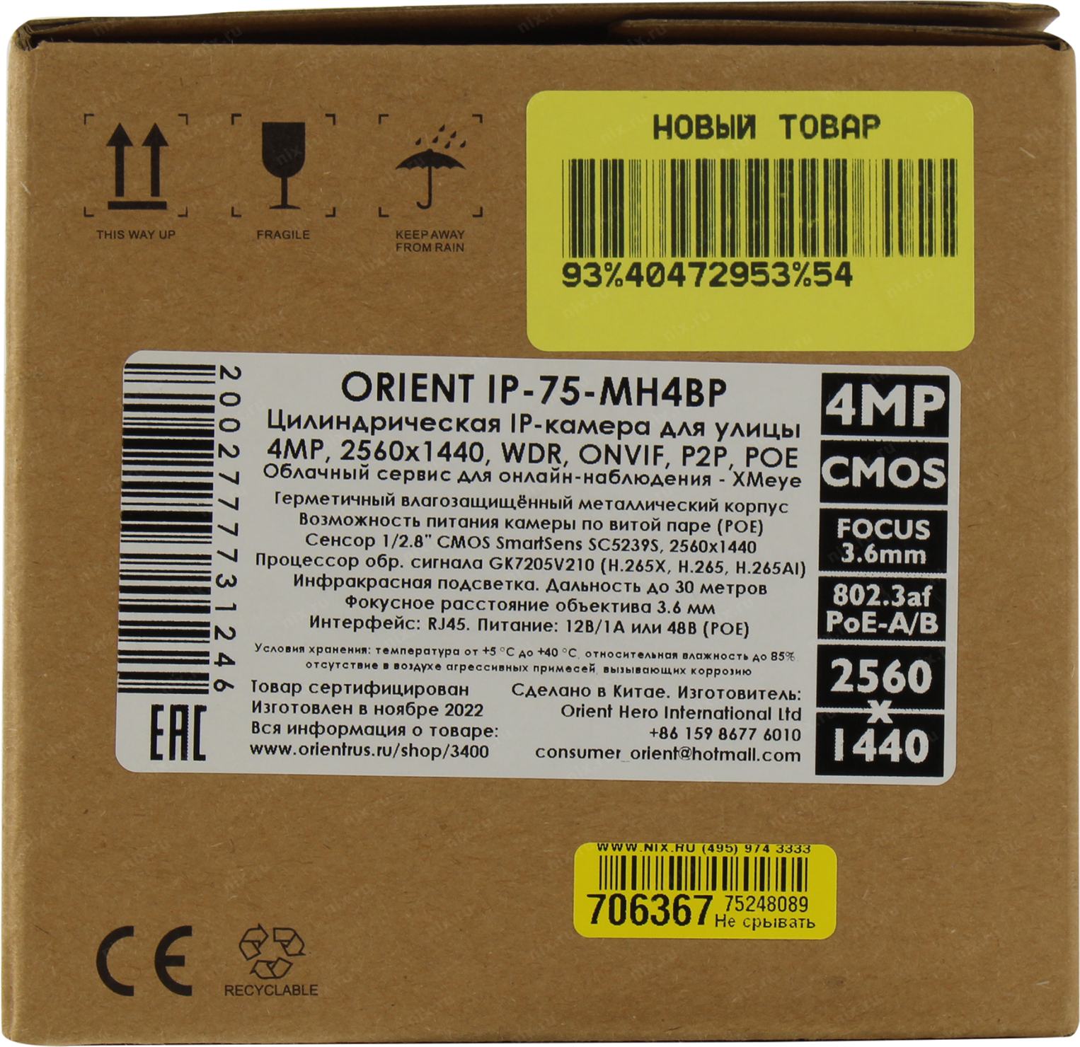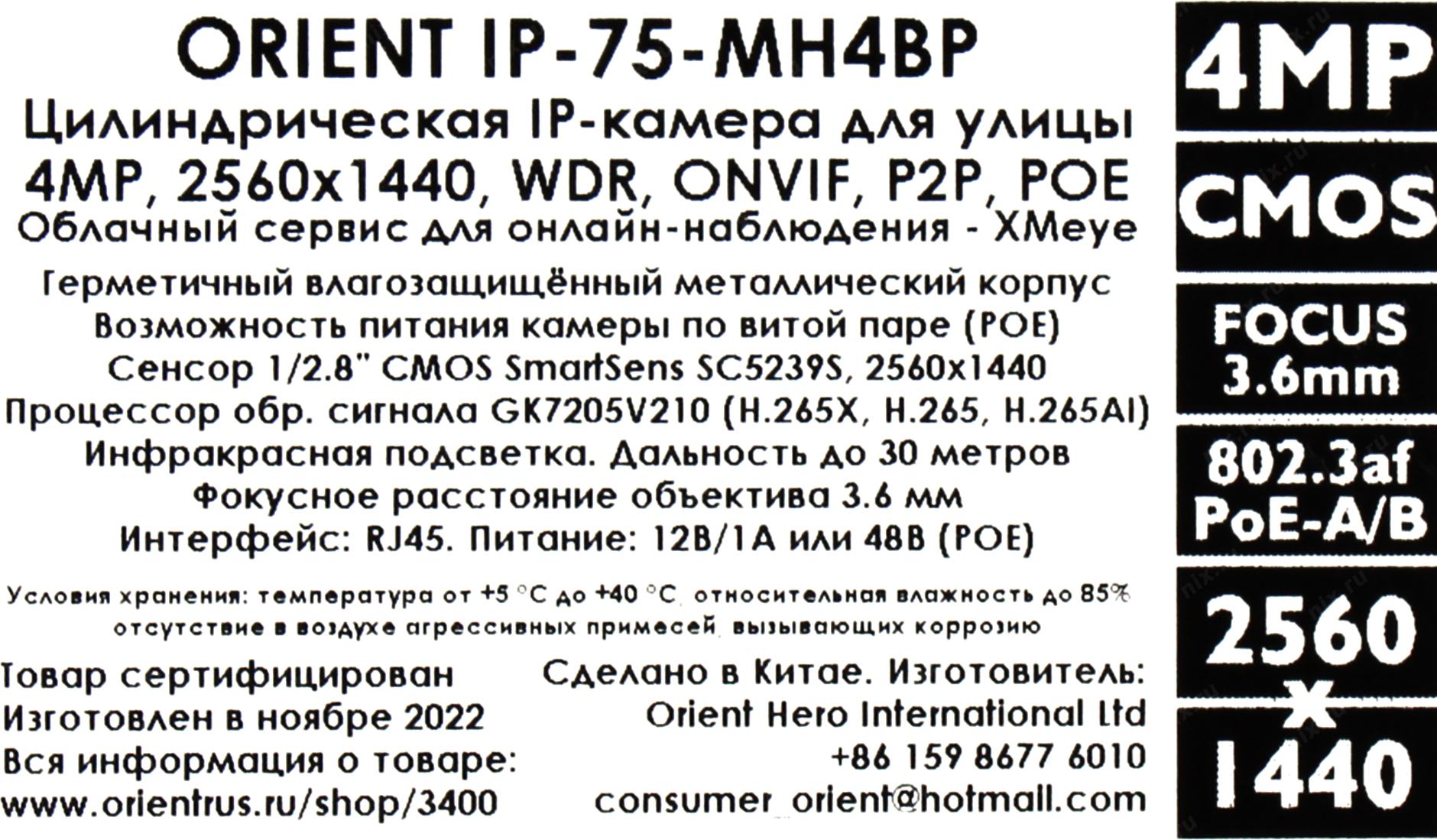 Интернет-камера Orient <IP-75-MH4BP> (2560x1440, f=3.6mm, 1UTP 100Mbps PoE, LED)
