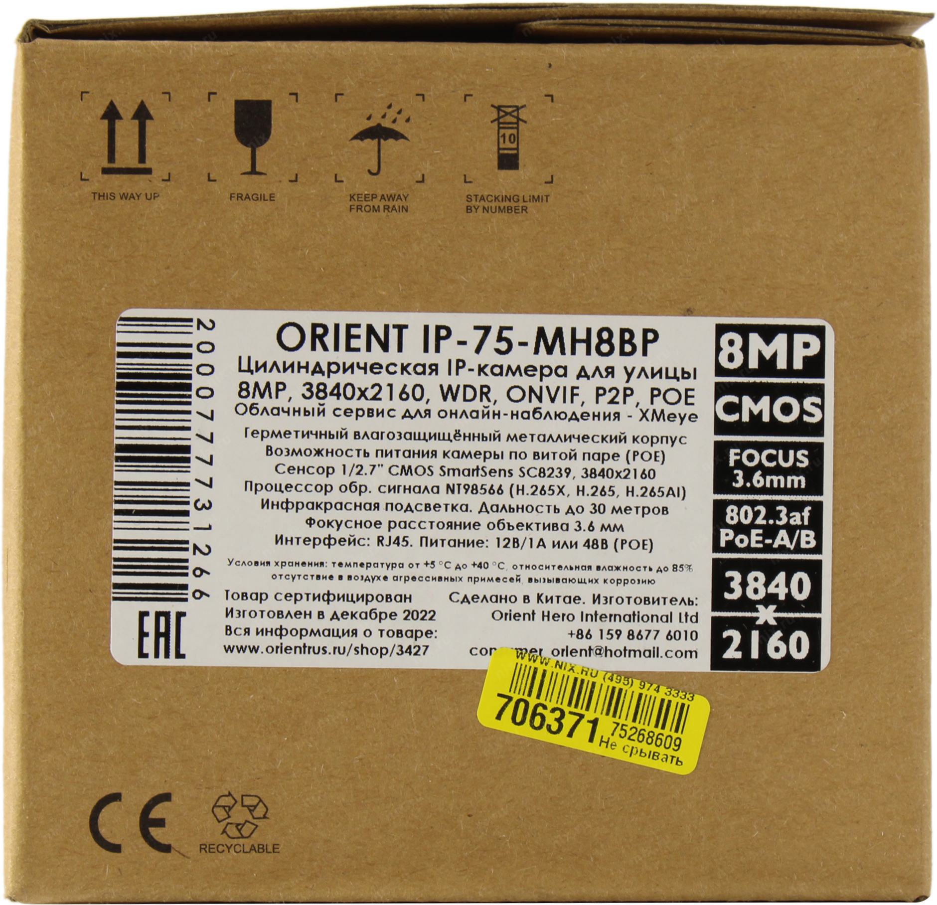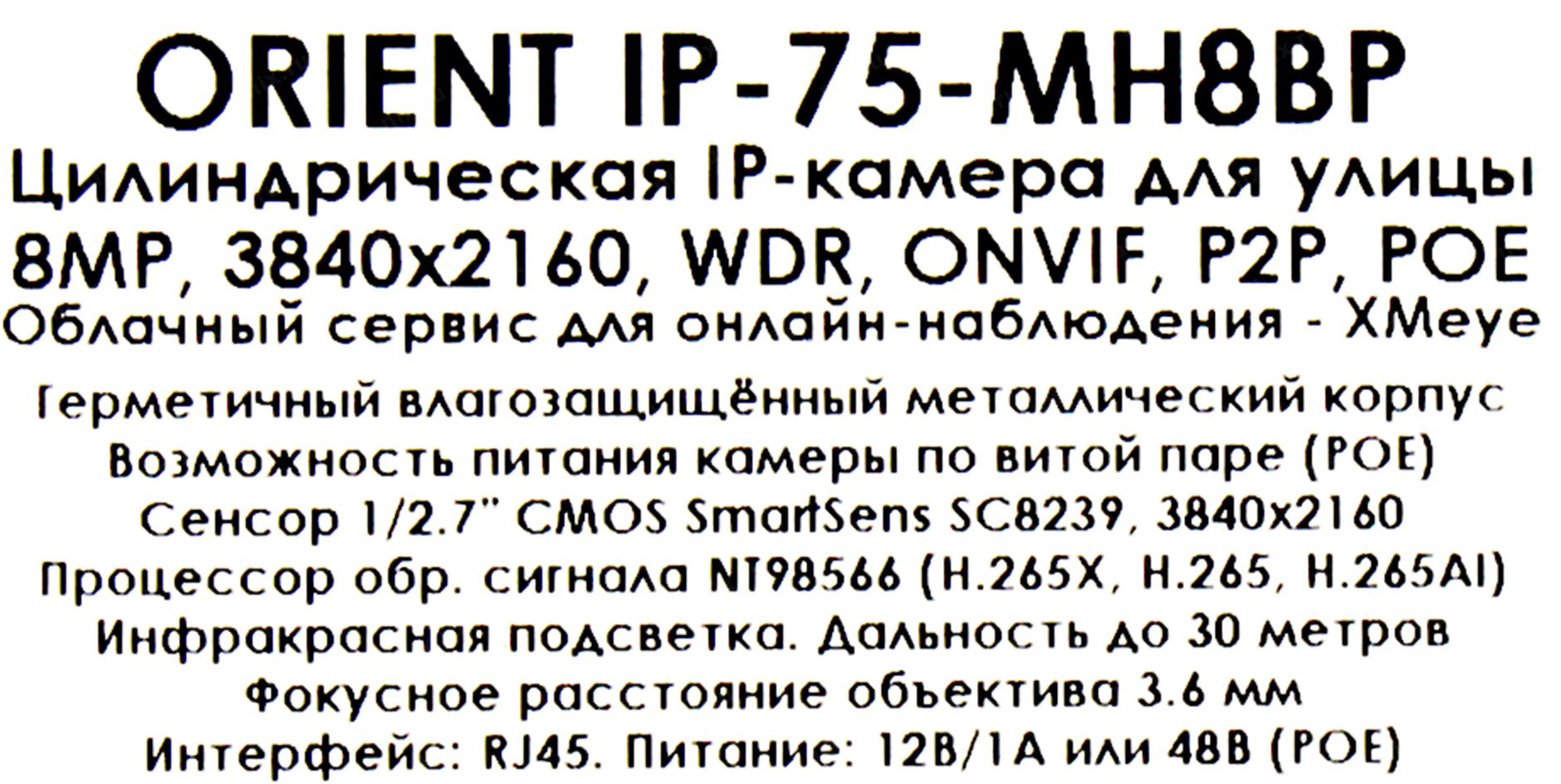 Интернет-камера Orient <IP-75-MH8BP> (3840x2160, f=3.6mm, 1UTP 100Mbps PoE, LED)