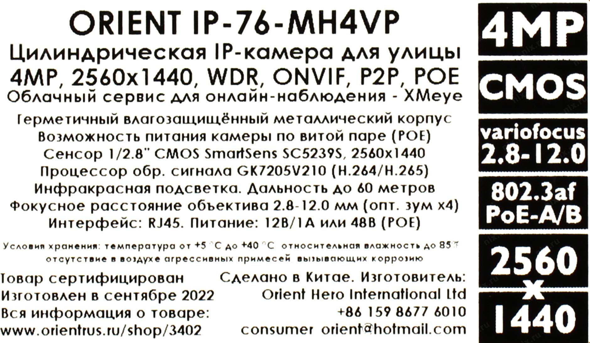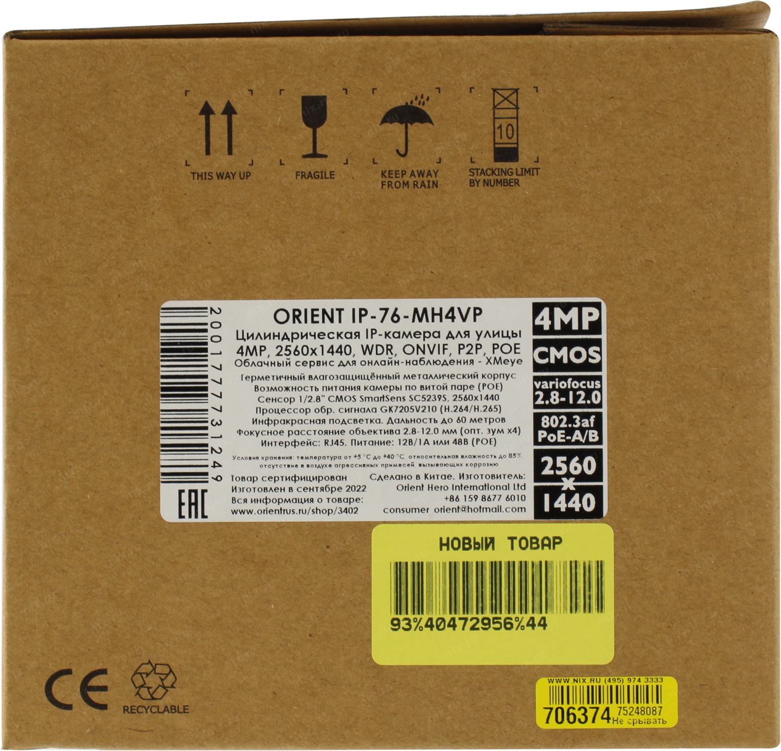 Интернет-камера Orient <IP-76-MH4VP> (2560x1440, f=3.6mm, 1UTP 100Mbps PoE, LED)
