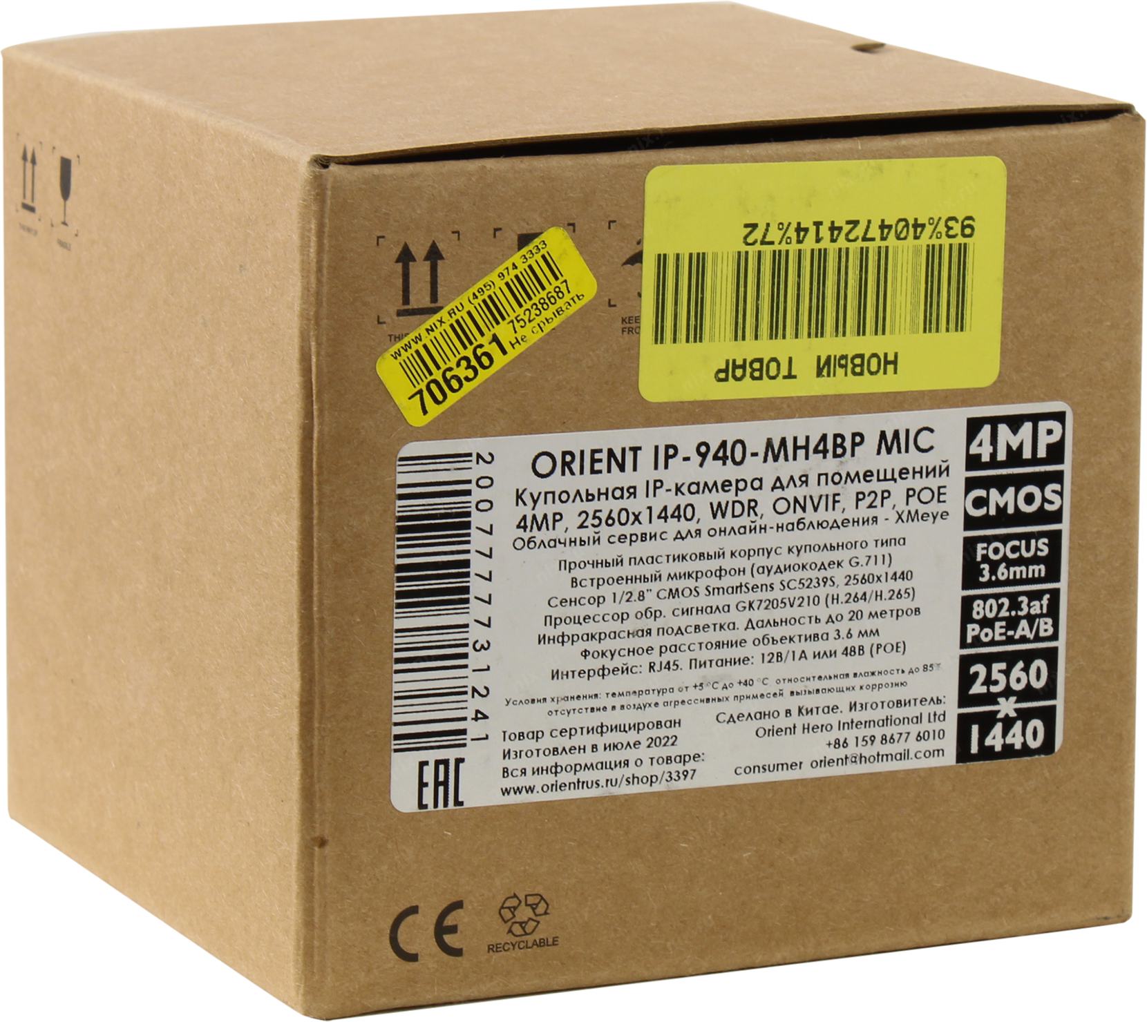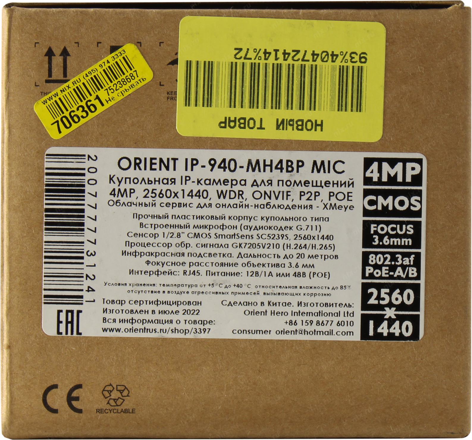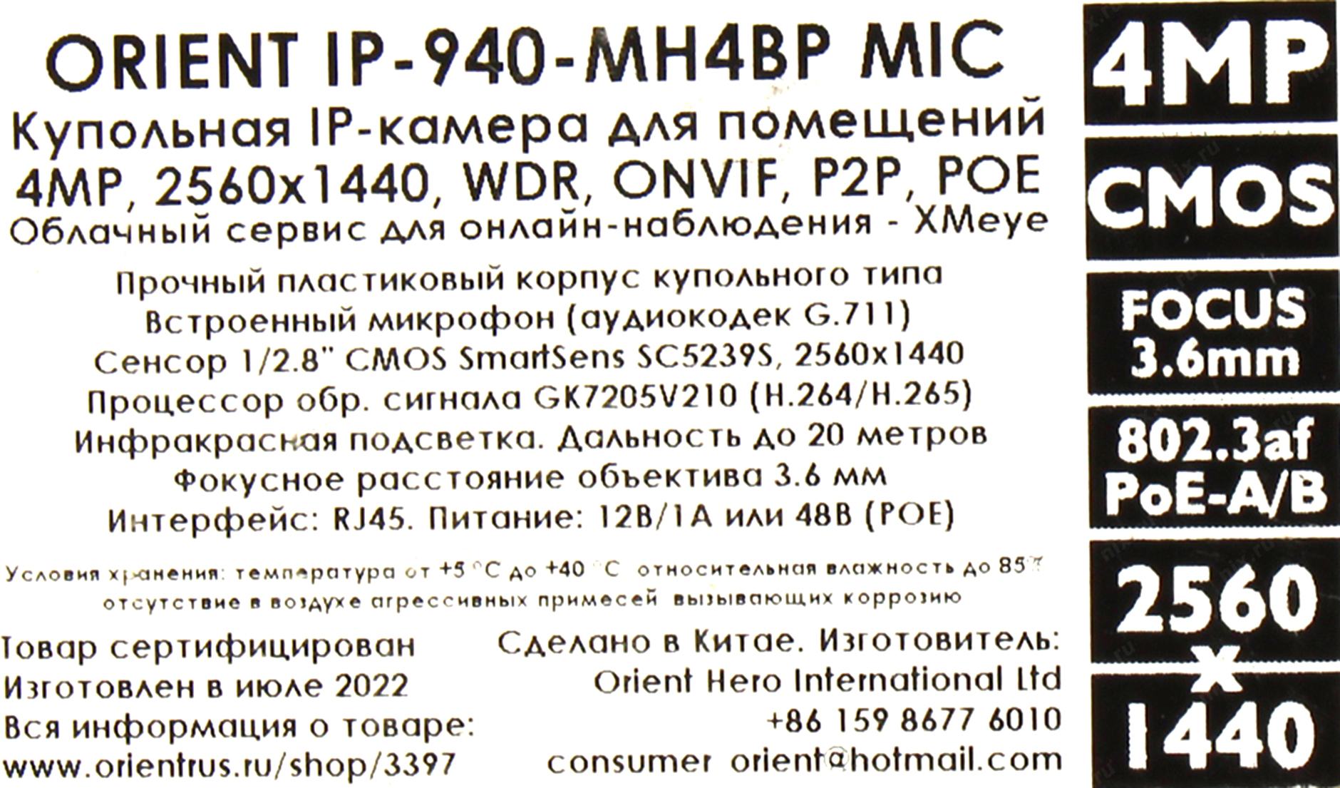 Видеокамера Orient <IP-940-MH4BP MIC> (2560x1440, f=3.6mm, 1UTP 100Mbps PoE, микрофон, LED)