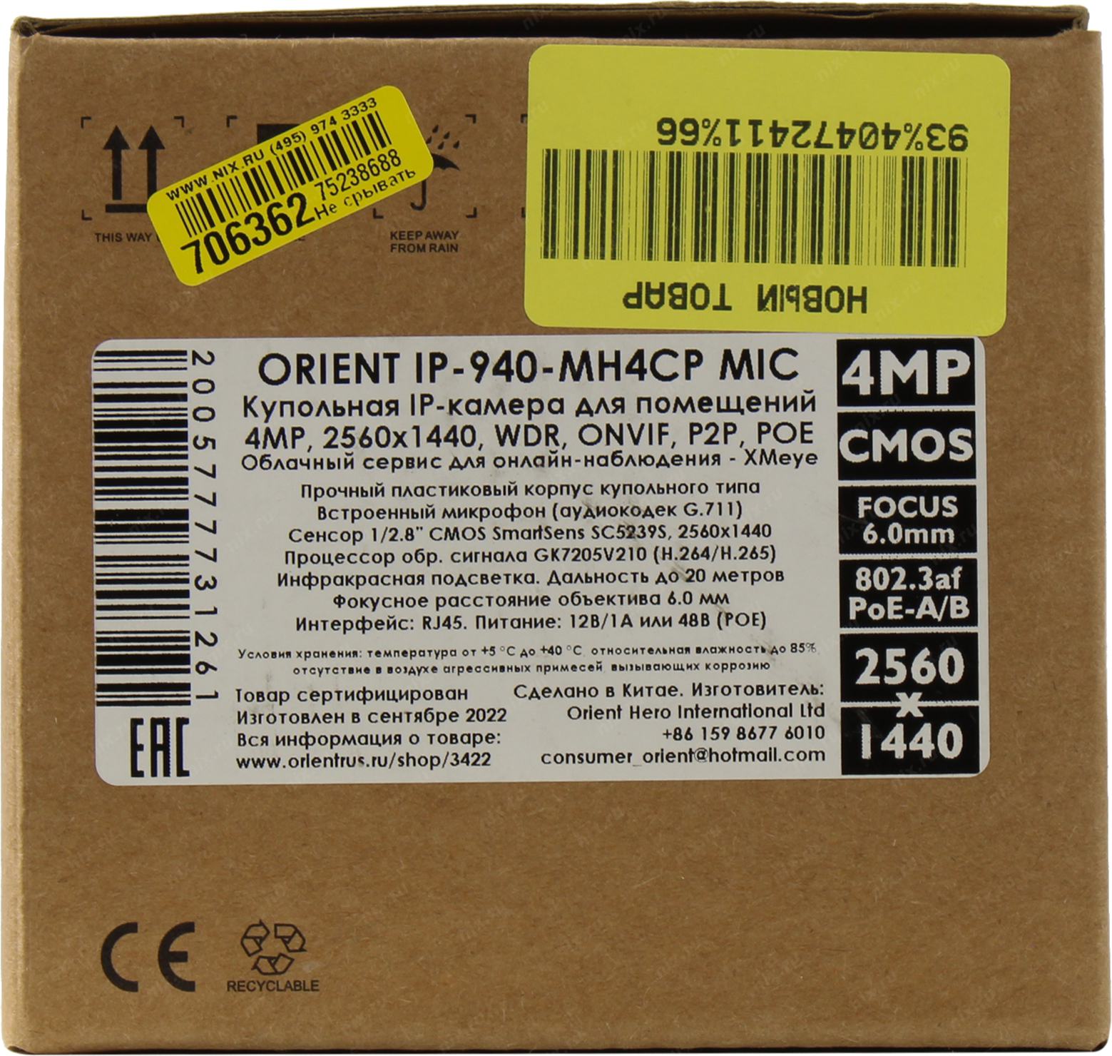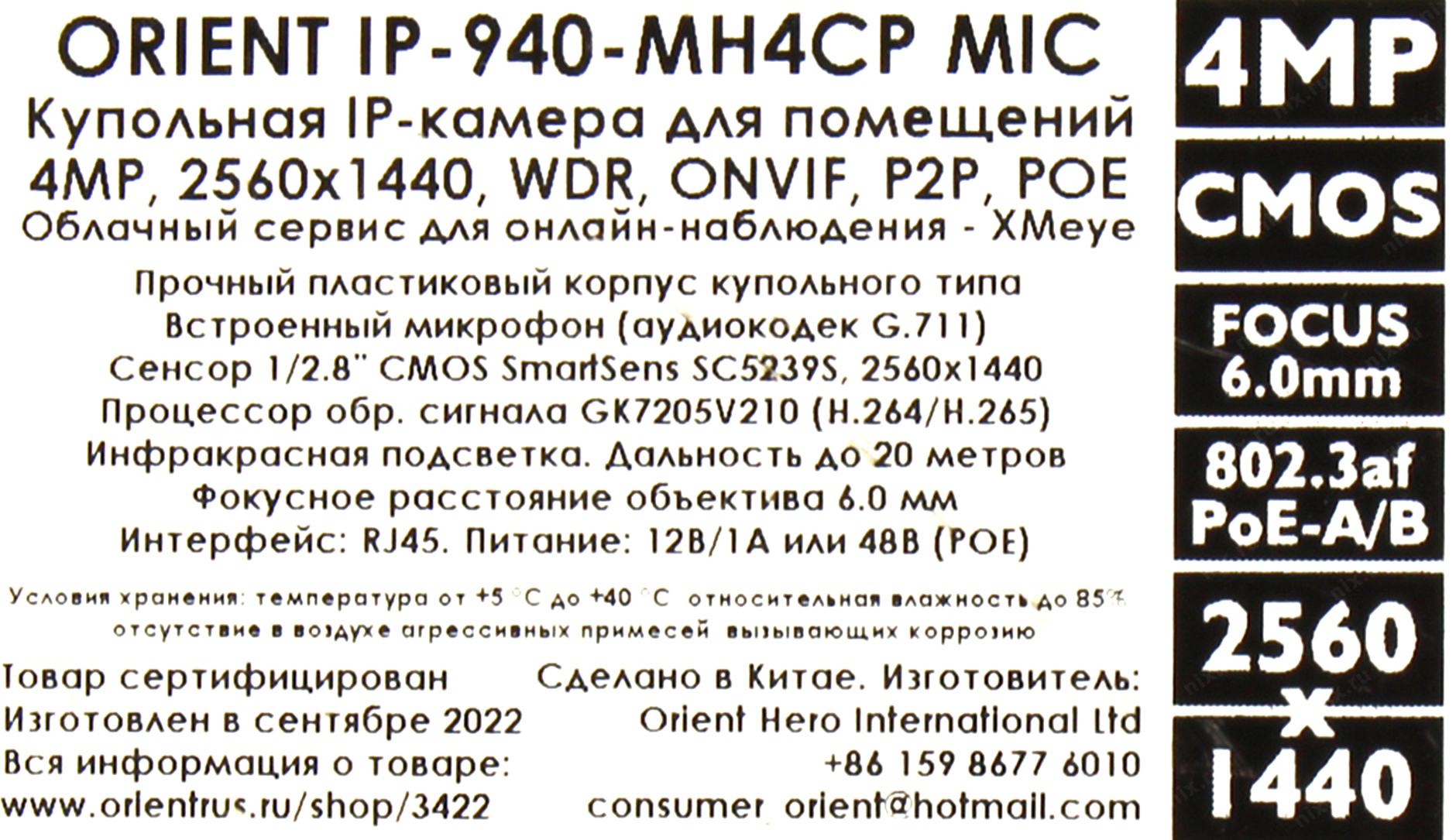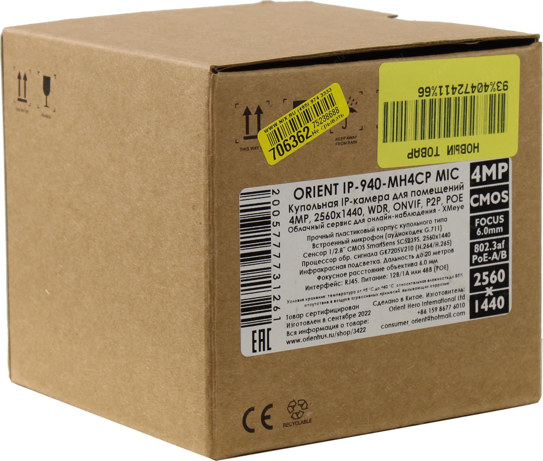 Видеокамера Orient <IP-940-MH4CP MIC> (2560x1440, f=6mm, 1UTP 100Mbps PoE, микрофон, LED)