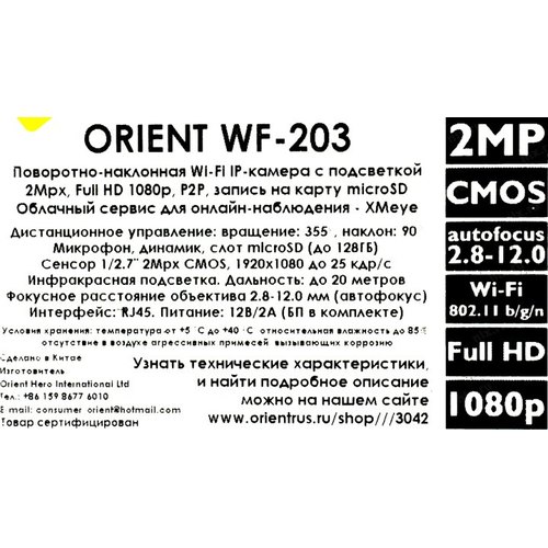 Видеокамера Orient <WF-203> (1920x1080, f=2.8-12mm, 1UTP 100Mbps, WiFi, PTZ, microSD, микрофон, LED)
