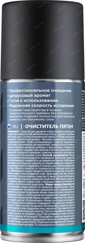 Эффективное средство для удаления наклеек, следов клея и скотча. Также может применяться для удаления битумных пятен, древесной смолы, гудрона, силикона и липкого слоя различного происхождения. Готов к применению. Средство для удаления любых клеевых материалов с различных поверхностей автомобиля и в быту; Удаляет наклейки, клей, смолу, скотч, остатки тонировочной пленки; Профессиональное очищение; Компактный размер; Высокие очищающие свойства; Цитрусовый аромат; Готов к использованию; Дерматологически безопасно; Средство представляет собой смесь органических растворителей, поверхностно-активных веществ, полезных активных добавок и пропеллента; Способ применения; Перед применением рекомендуется проверить действие средства на обрабатываемую поверхность на незаметном участке; Необходимо равномерно распределить средство на обрабатываемую поверхность или удаляемую этикетку; Выдержать 2-4 минуты для полного воздействия состава; Распылить средство на салфетку; Удалить остатки клея с помощью ткани или бумажной салфетки, пропитанной средством; Перед использованием внимательно ознакомиться с информацией, указанной на этикетке!; Транспортируются любым видом транспорта, кроме авиационного, в упаковке изготовителя в соответствии с правилами перевозки грузов на данном виде транспорта; Медленная скорость испарения: Сохраняет свои свойства в течение продолжительного времени без повторного нанесения, позволяя полностью раствориться клеевому или битумному слою; Отделить этикетку от поверхности, потянув за ее край: При необходимости можно провести обработку еще раз. Некоторые этикетки имеют плотный верхний слой, ламинацию или лак, который препятствует проникновению средства. В таком случае необходимо предварительно отделить поверхностный слой; ПРАВИЛА УТИЛИЗАЦИИ: Не нарушать целостность упаковки и не сжигать даже после использования! После использования баллон утилизируется как бытовой отход
