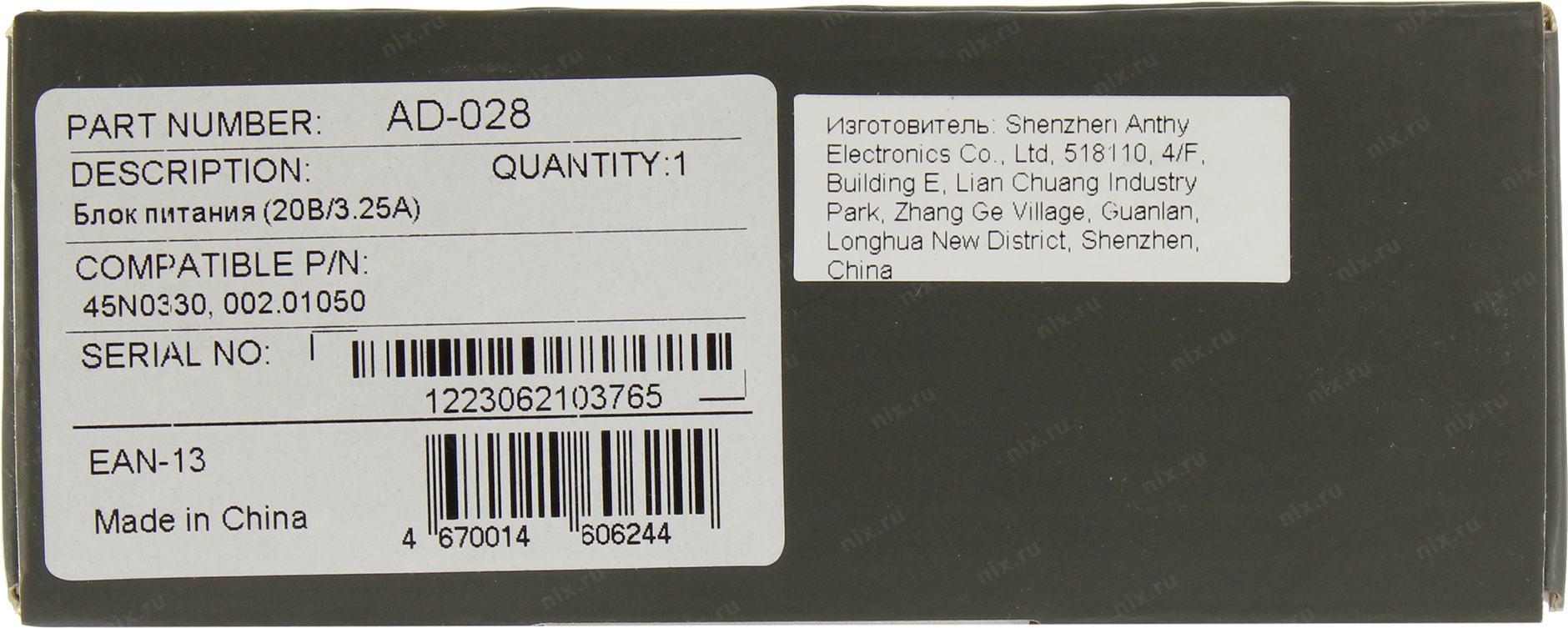 Блок питания Pitatel AD-028 для ноутбуков IBM (20V 3.25A)