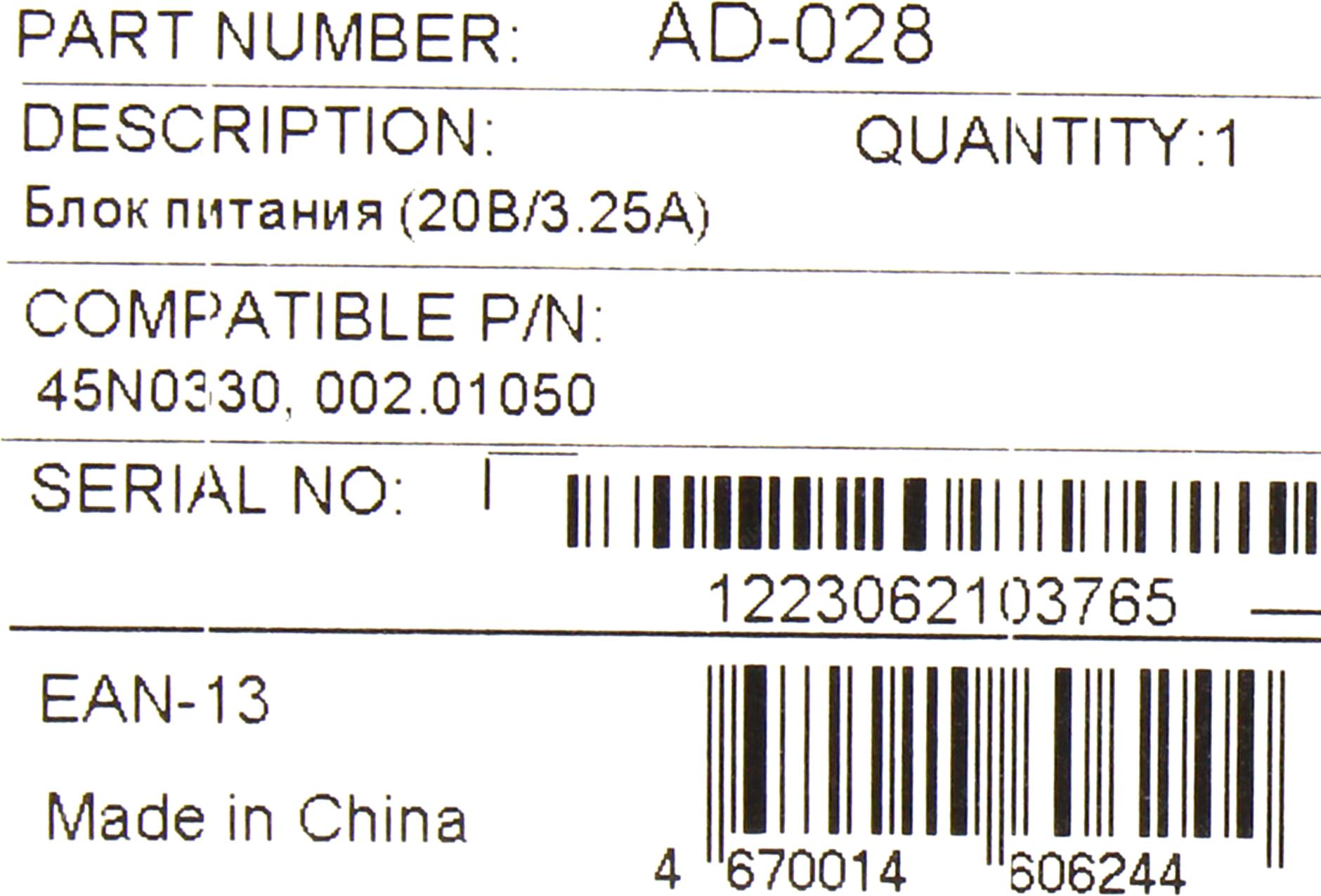 Pitatel <AD-028> блок питания для ноутбуков IBM (20V, 3.25A, 45N0330, 002.01050)