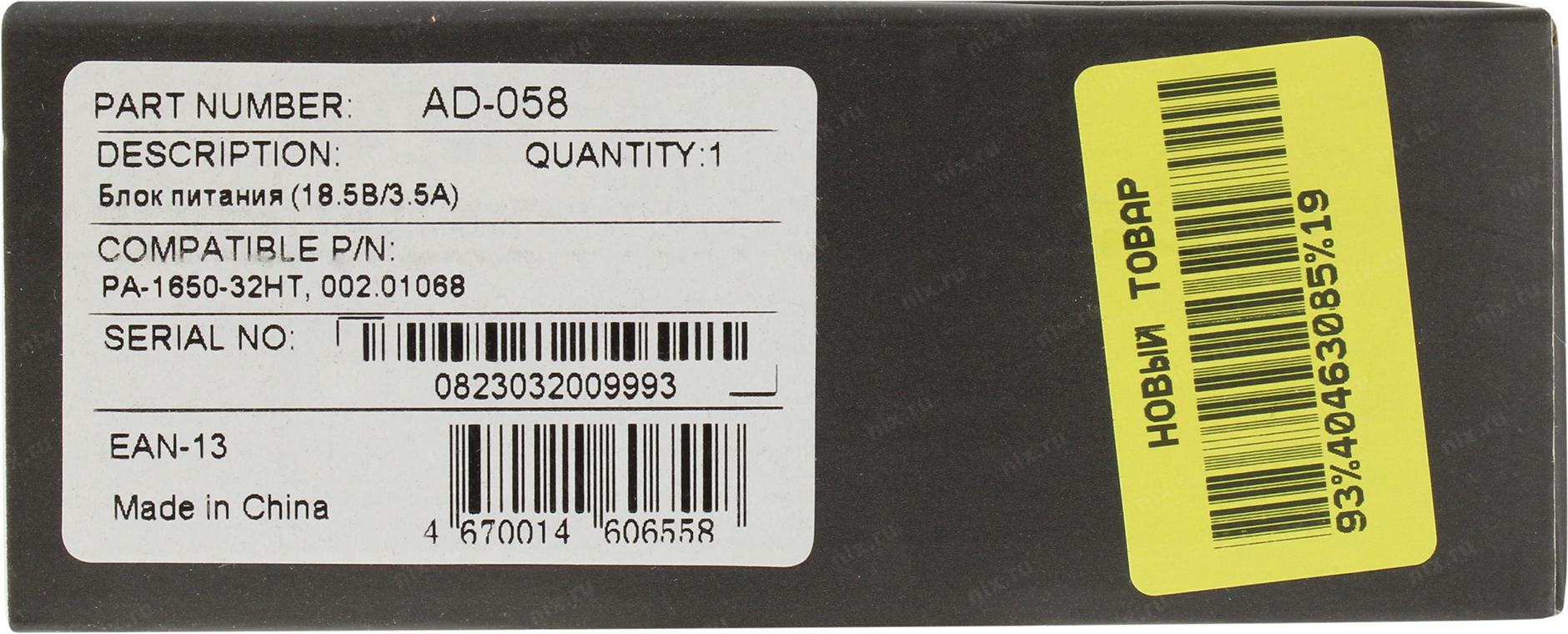 Pitatel <AD-058> блок питания для ноутбуков HP Compaq (18.5V, 3.5A, PA-1650-32HT, 002.01068)