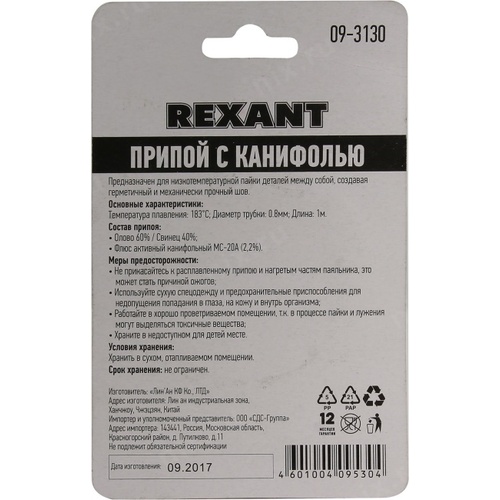 Припой с канифолью - широко применяется в пайке для соединения деталей прочным и надёжным швом. Припой с канифолью Rexant - это проволока толщиной 0.8 мм, состоящая из сплава олова (60%) и свинца (40%). Содержание флюса канифольного активного MC-20A составляет 2.2%.