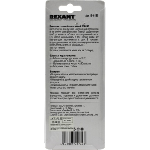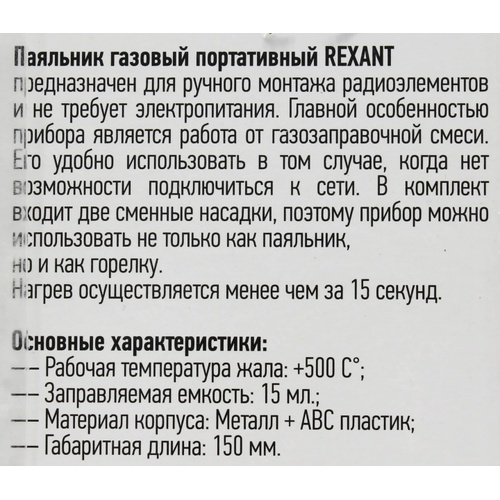Портативный газовый паяльник удобен в тех случаях, когда на месте применения отсутствует возможность подключения к электросети. Газовый паяльник Rexant можно использовать в качестве газовой горелки (насадка в комплекте).