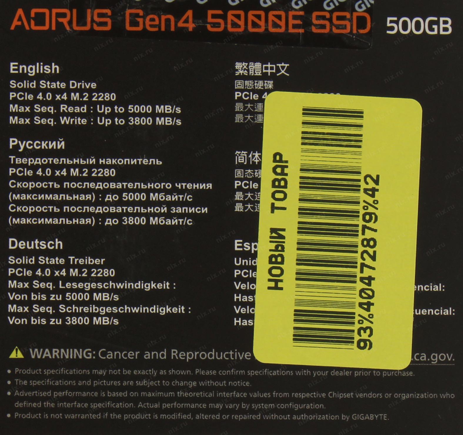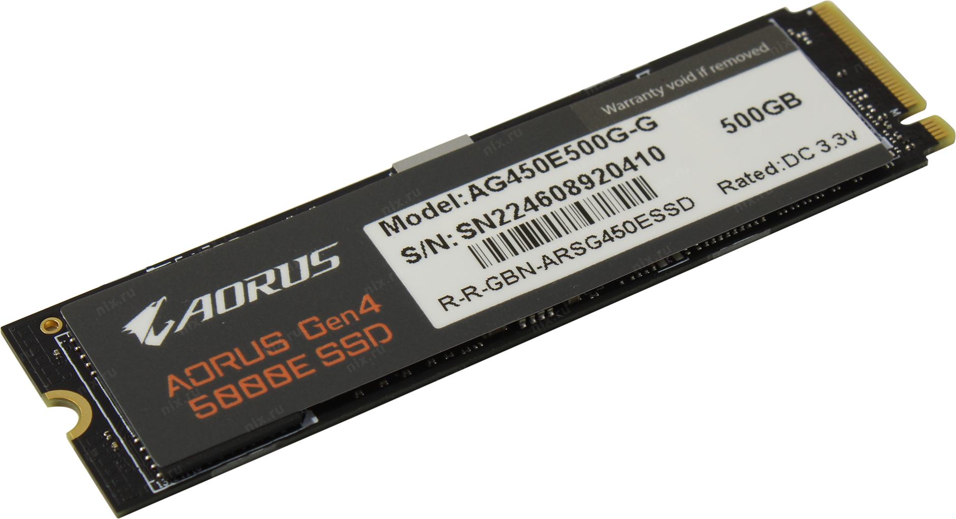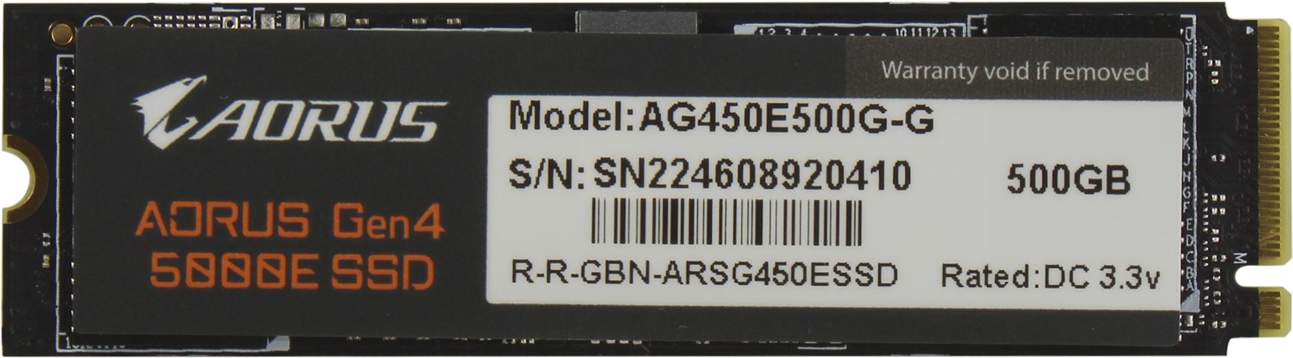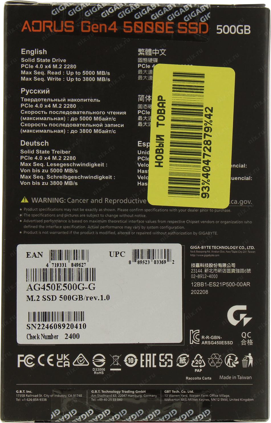 Твердотельный накопитель SSD Gigabyte AORUS 500GB M.2 2280 AG450E500G-G Client PCI-Express 4.0 x4, NVMe 1.4 5000/3800 RTL