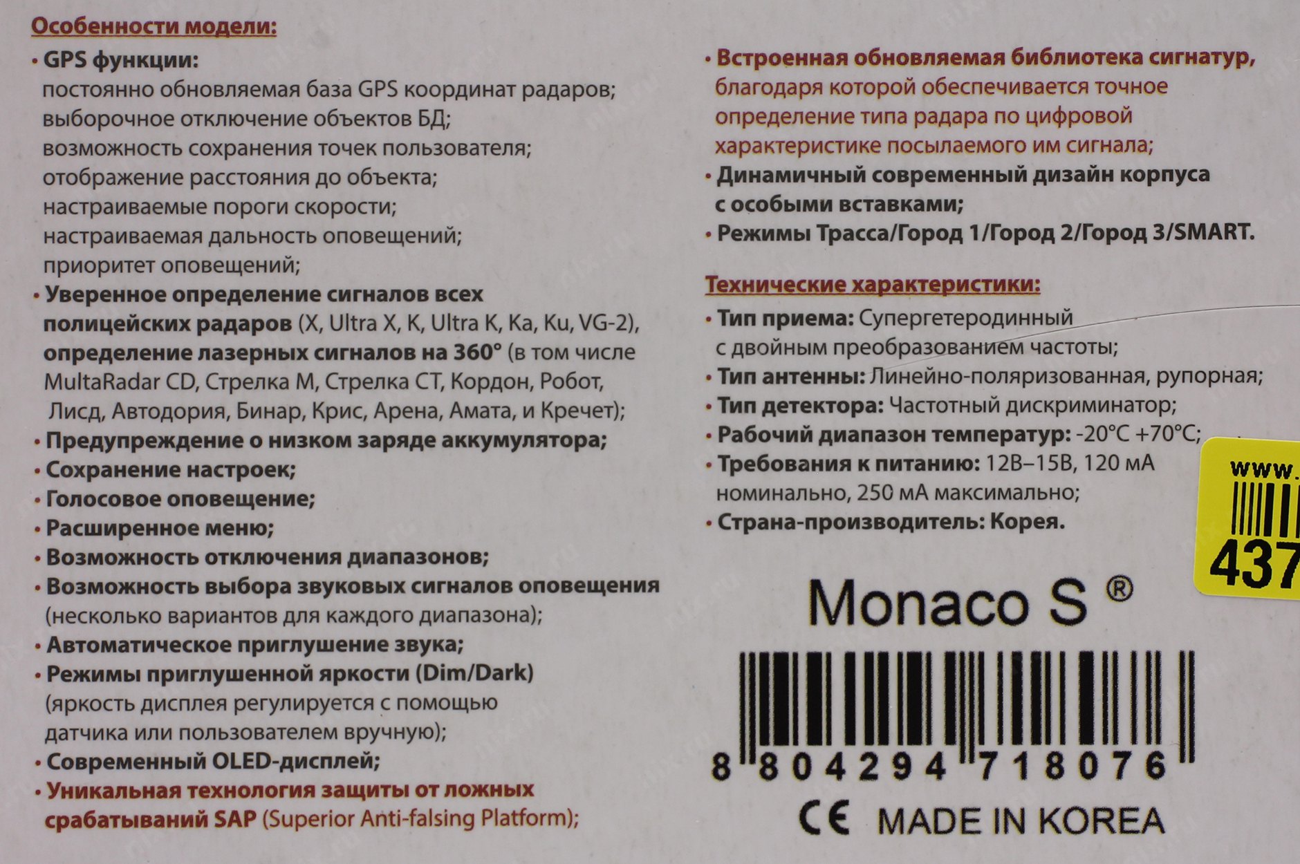 Радар-детектор со встроенным GPS прие"мником, высокочувствительным радаром с возможностью настройки чувствительности и встроенной памятью для базы данных с координатами объектов повышенного внимания (камер ДПС, постов ДПС и проч.). OLED-экран радар-детектора способен отображать точное время (по GPS), расстояние до камер и направление движения. Есть функция сигнатурного анализа камер видеофиксации для минимизации ложных срабатываний в K-диапазоне.