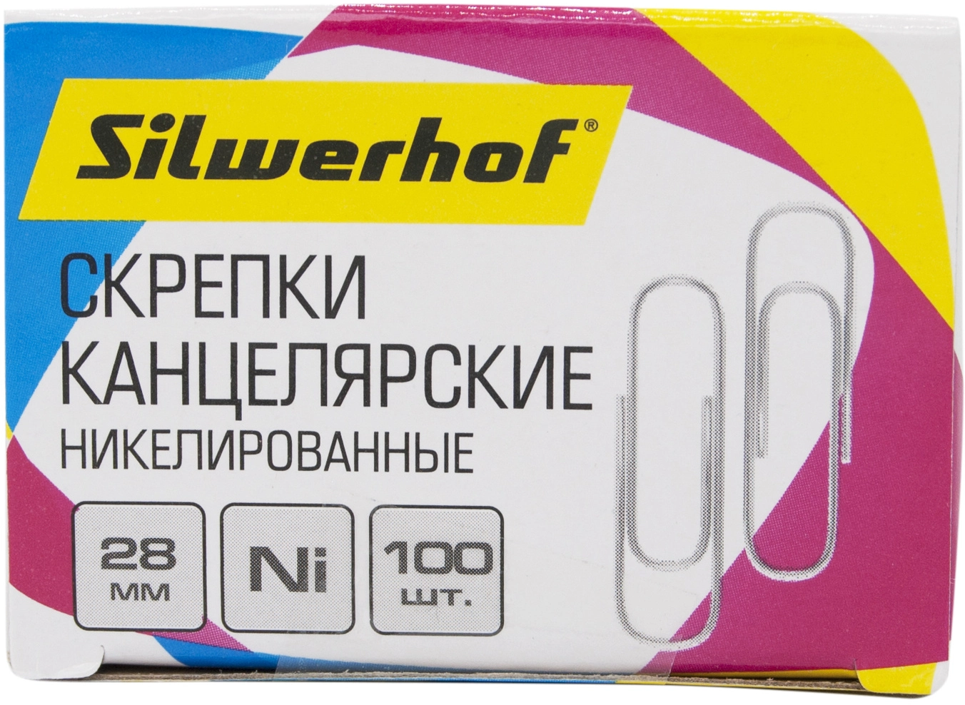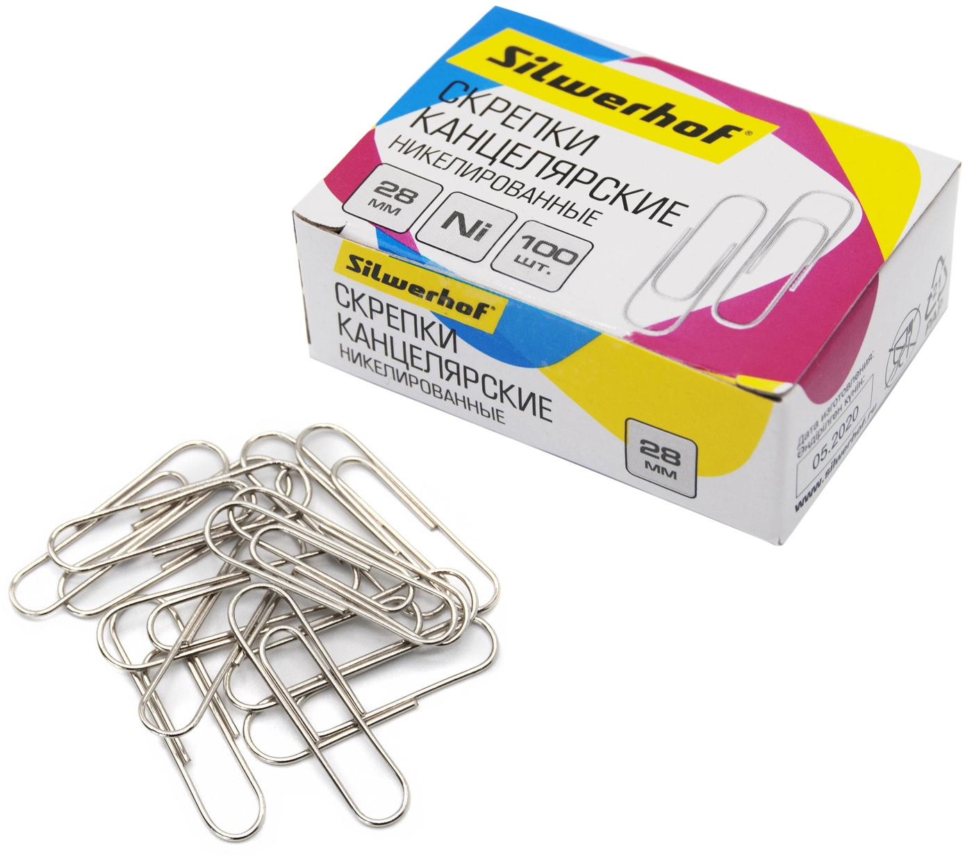 Скрепки Silwerhof 194041 никель 28мм (упак.:100шт) картонная коробка (продается кратно 10 шт.)
