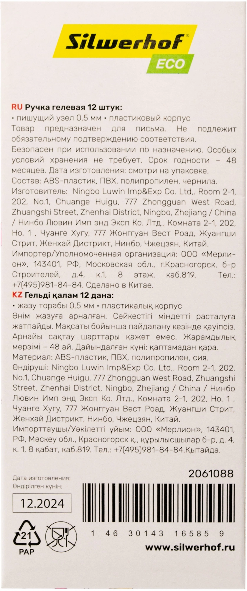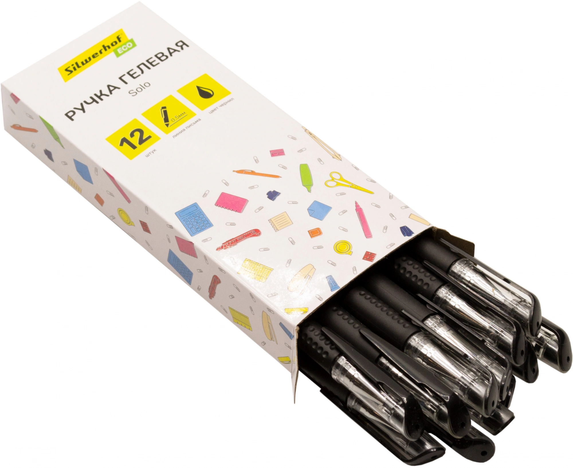 Ручка гелев. Silwerhof Eco Solo d=0.5мм черн. черн. кор.карт. сменный стержень игловидный пиш. наконечник линия 0.5мм (продается кратно 12 шт.)