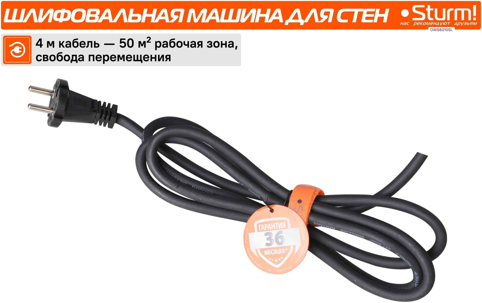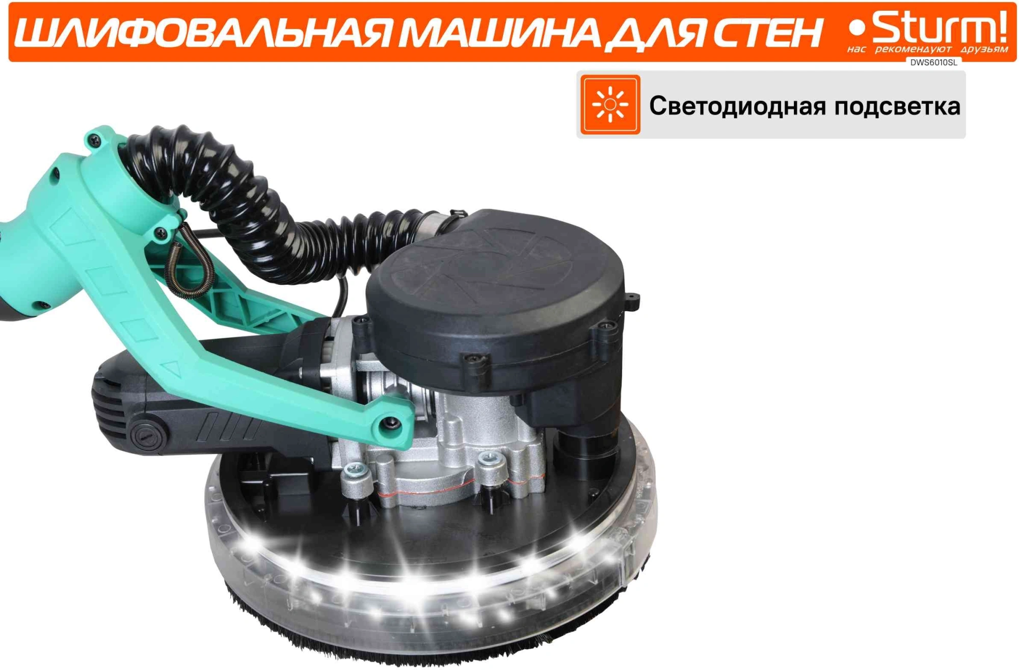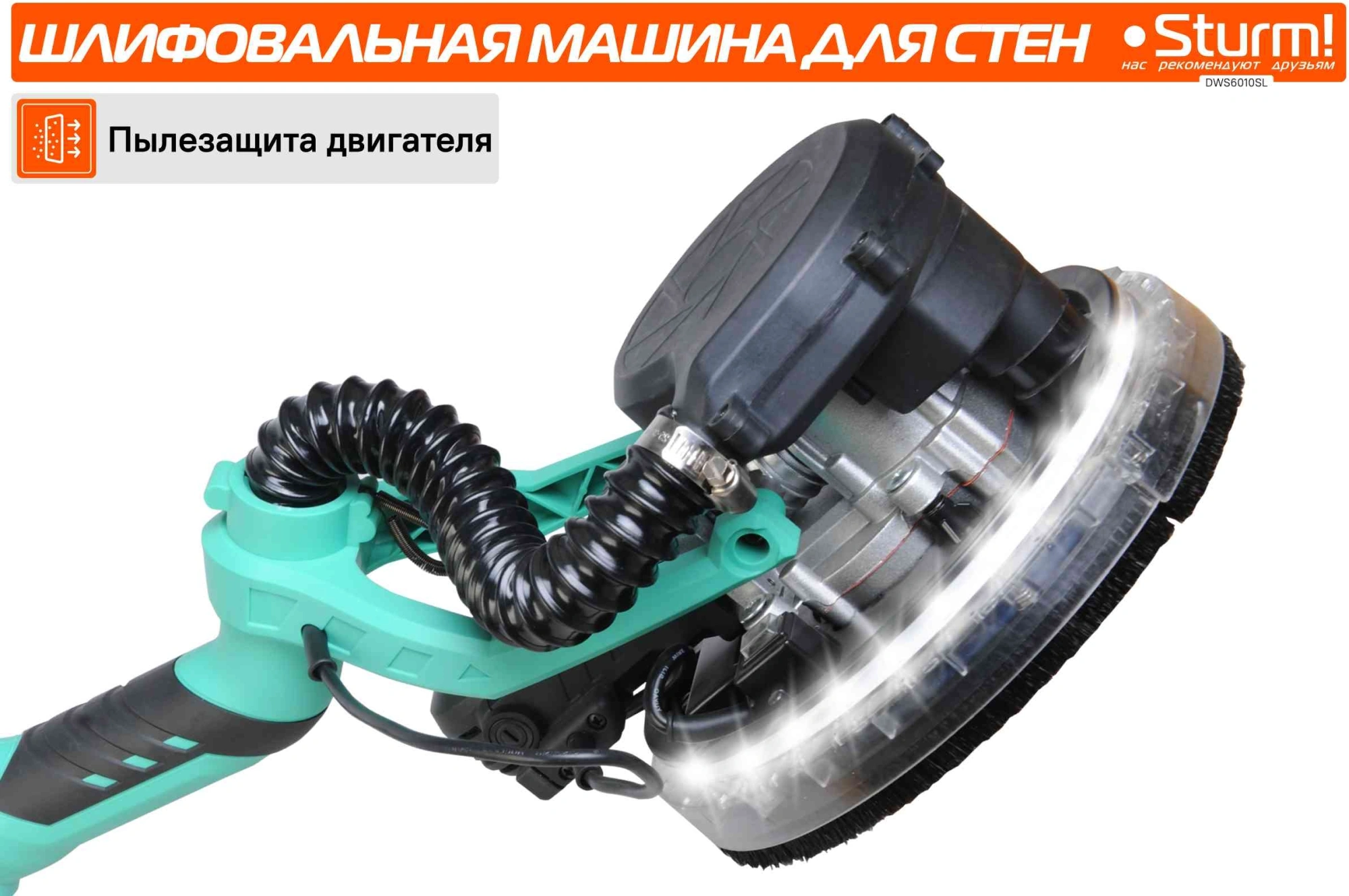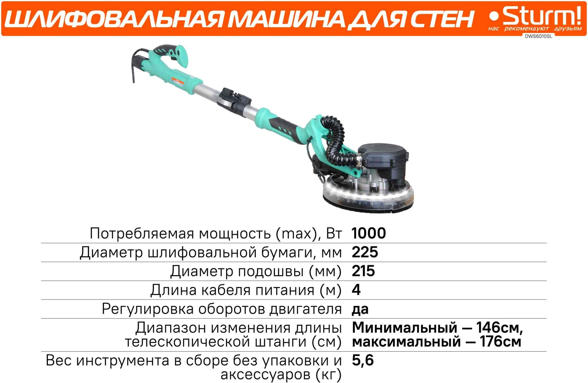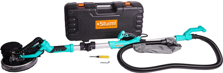 Шлифмашина предназначена для шлифовки гипсокартонных панелей, стен, потолков. Длина кабеля питания - 4 м. Светодиодная подсветка. Функция всасывания - возможность работать без пылесоса. Телескопическая штанга 146-176 см.