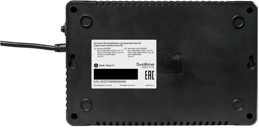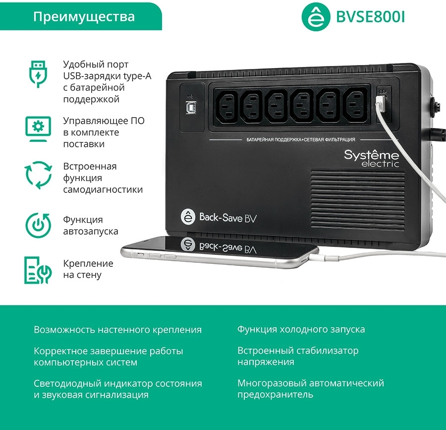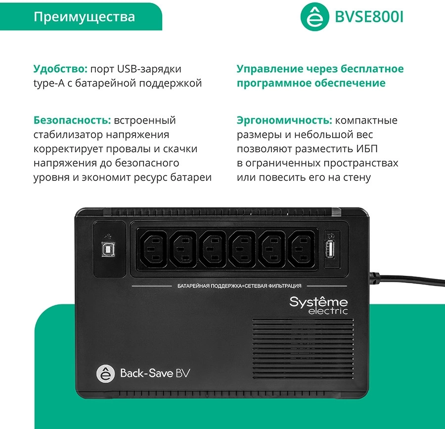 ИБП Back-Save BV Systeme Electric 800 ВА, автоматическая регулировка напряжения, 6 розеток С13, 230 В, 1 USB Type-A