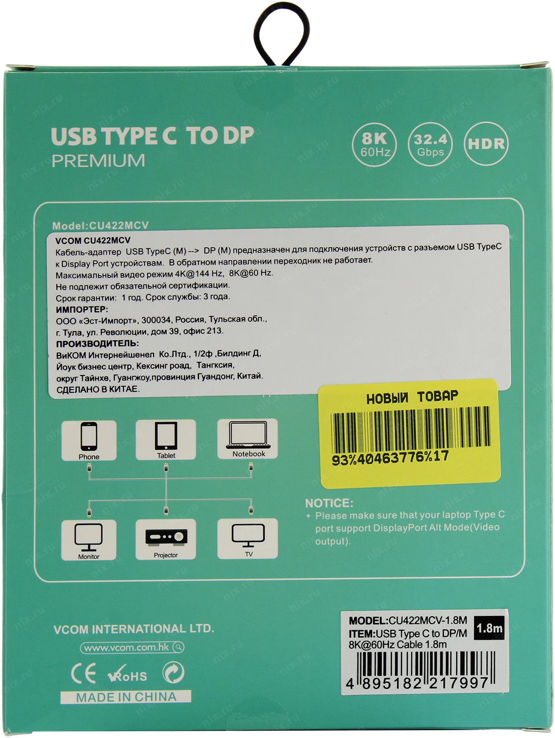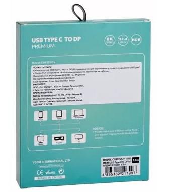 Кабели VCOM CU422MCV-1.8M Кабель-адаптер USB 3.1 Type-Cm --> DP(m) 8K@60Hz, 1.8m , Alumi Shell,VCOM <CU422MCV-1.8M> (4895182217980/4895182217997)
