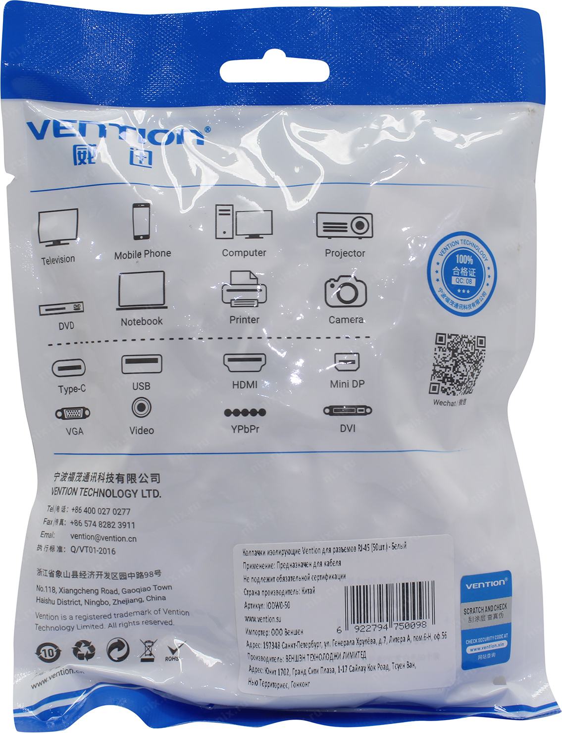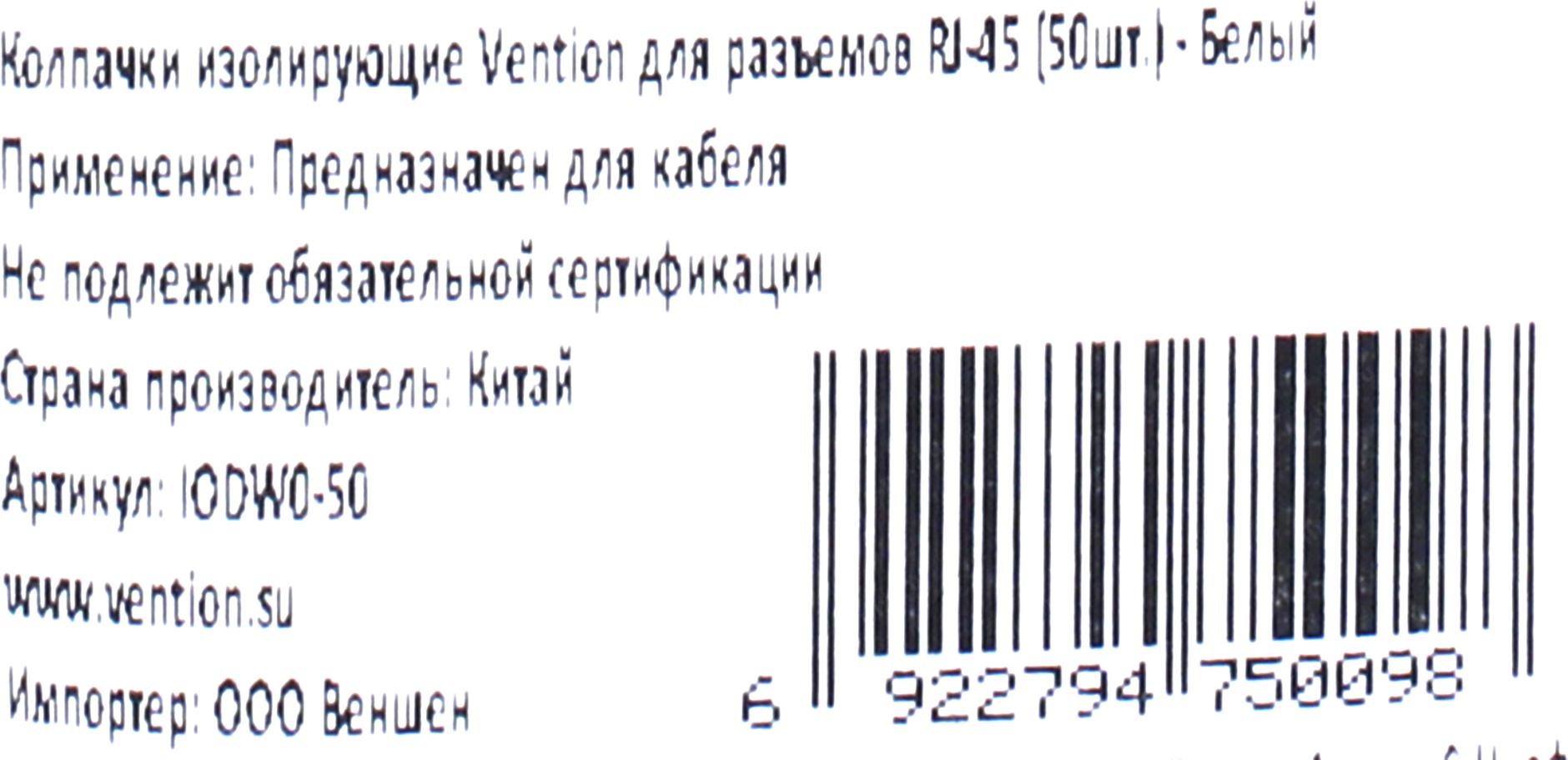 Vention <IODW0-50> Колпачок изолирующий для коннектора RJ-45 (уп-ка 50 шт, белый)